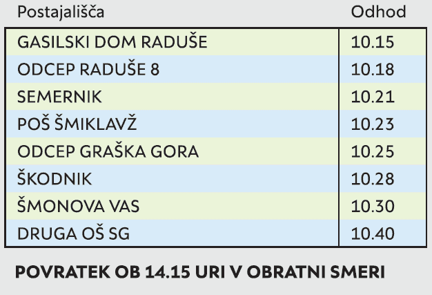 POSTAJALIŠČA: GD RADUŠE, ODCEP RADUŠE 8, SMERNIK, ODCEP GRAŠKA GORA, ŠKODNIK, ŠMONOVA VAS, DRUGA OSNOVNA ŠOLA
