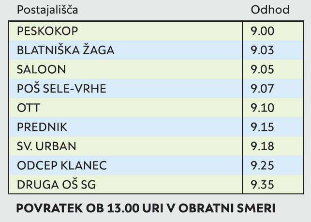 POSTAJALIŠČA: PESKOKOP, BLATNIŠKA ŽAGA, SALOON, POŠ SELE, OTT, PREDNIK, SV. URBAN, ODCEP KLANEC, DRUGA OSNOVNA ŠOLA