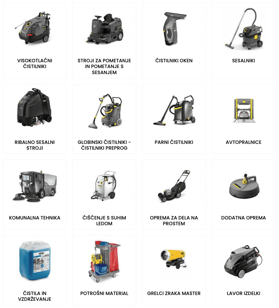 - čiščenje talnih površin: Kärcher čistilne naprave za talne površine omogočajo učinkovito čiščenje ploščic, laminata, parketa, betona in drugih trdih tal. Z visokotlačnimi čistilniki, parnimi čistilniki, čistilci za okna, tla, s sesalniki in pestro ponudbo čistilnih sredstev, boste dosegli, da bo vaš dom zasijal v najboljši luči.