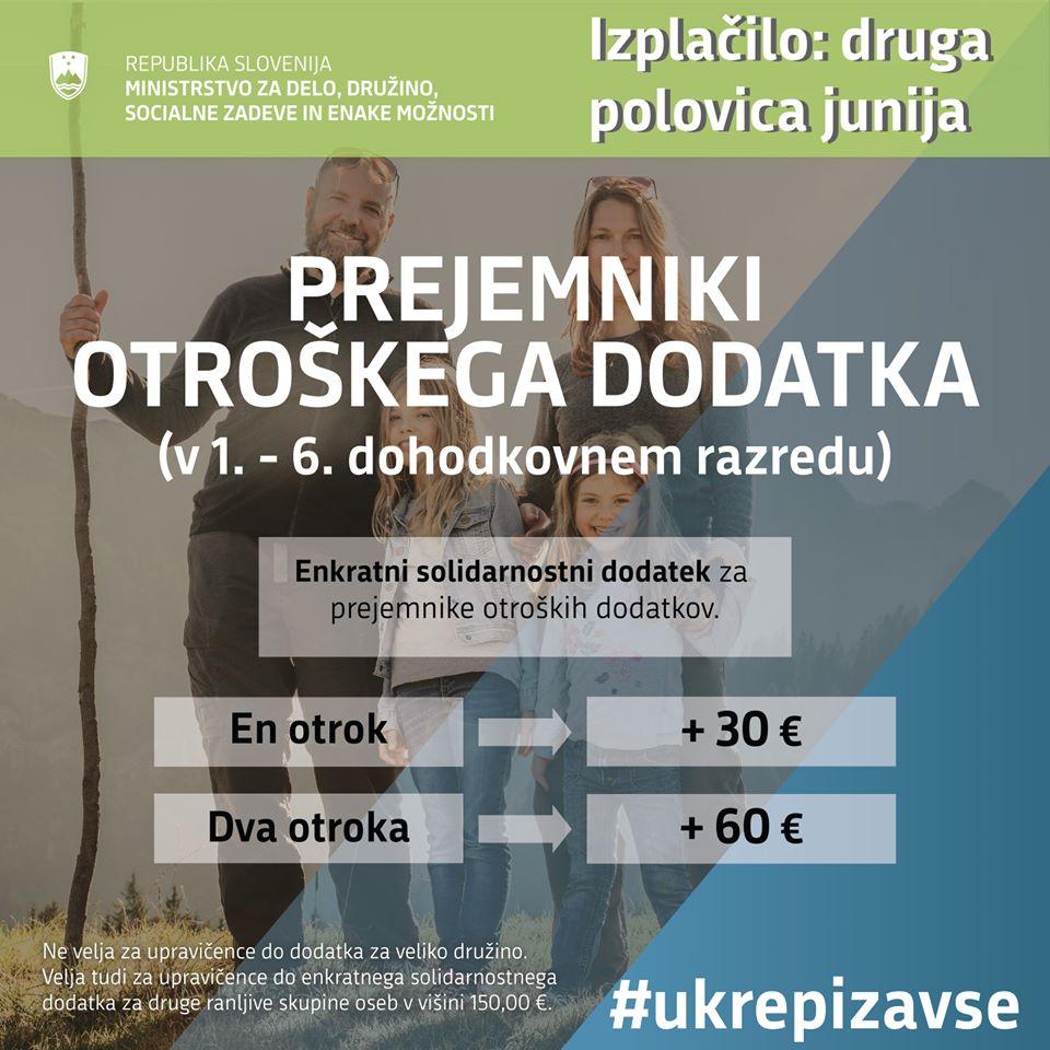 Ministrstvo za delo, družino, socialne zadeve in enake možnosti pod vodstvom ministra Janeza Ciglerja Kralja je za omilitev posledic epidemije pripravilo ukrep enkratnega solidarnostnega dodatka družinam z enim ali dvema otrokoma.