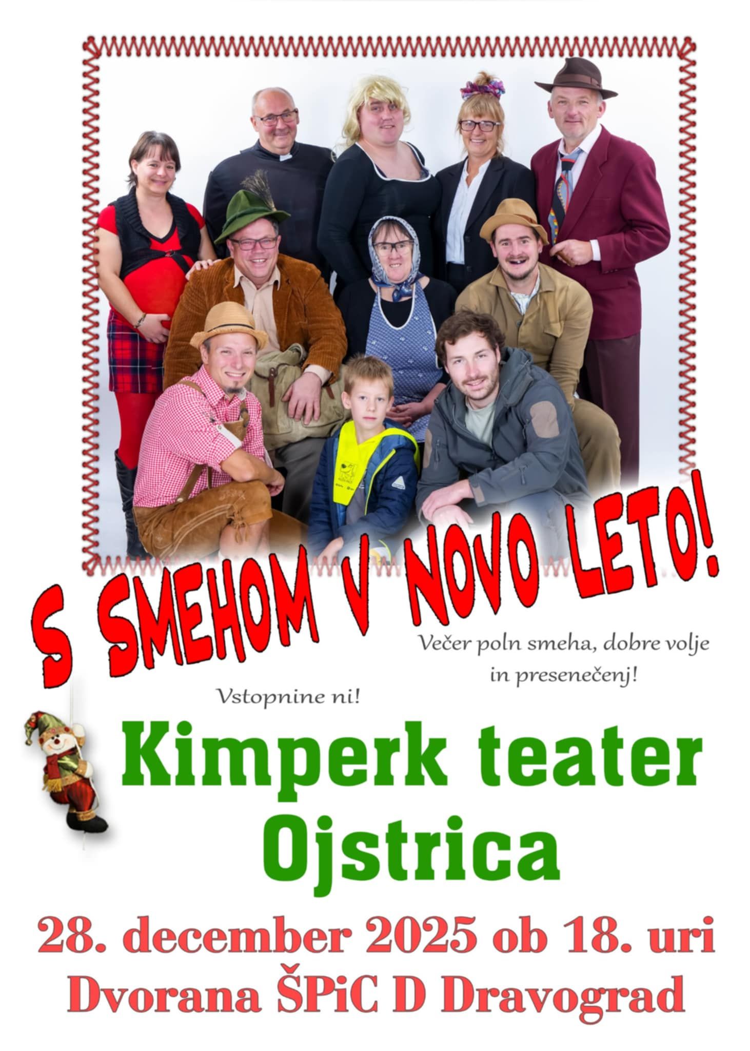 Tudi letos se nam v nedeljo, 28. decembra 2025, ob 18. uri, obeta dobra doza smeha v Dvorani Špic D v Dravogradu, kamor vas vabi Kimperk terater.