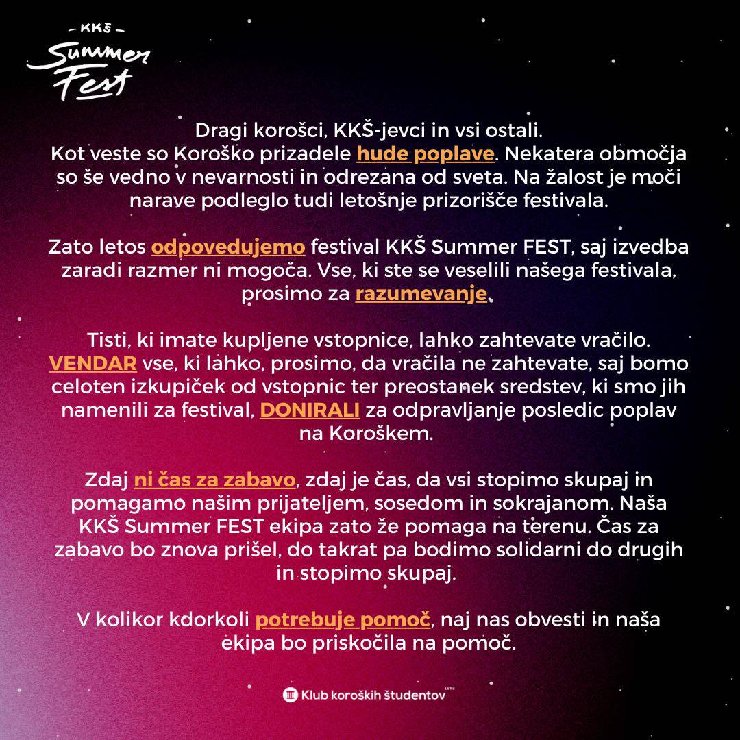 "Dragi korošci, KKŠ-jevci in vsi ostali. Kot veste so Koroško prizadele hude poplave. Nekatera območja so še vedno v nevarnosti in odrezana od sveta. Na žalost je moči narave podleglo tudi letošnje prizorišče festivala. Zato letos odpovedujemo festival KKŠ Summer FEST, saj izvedba zaradi razmer ni mogoča. Vse, ki ste se veselili našega festivala, prosimo za razumevanje."