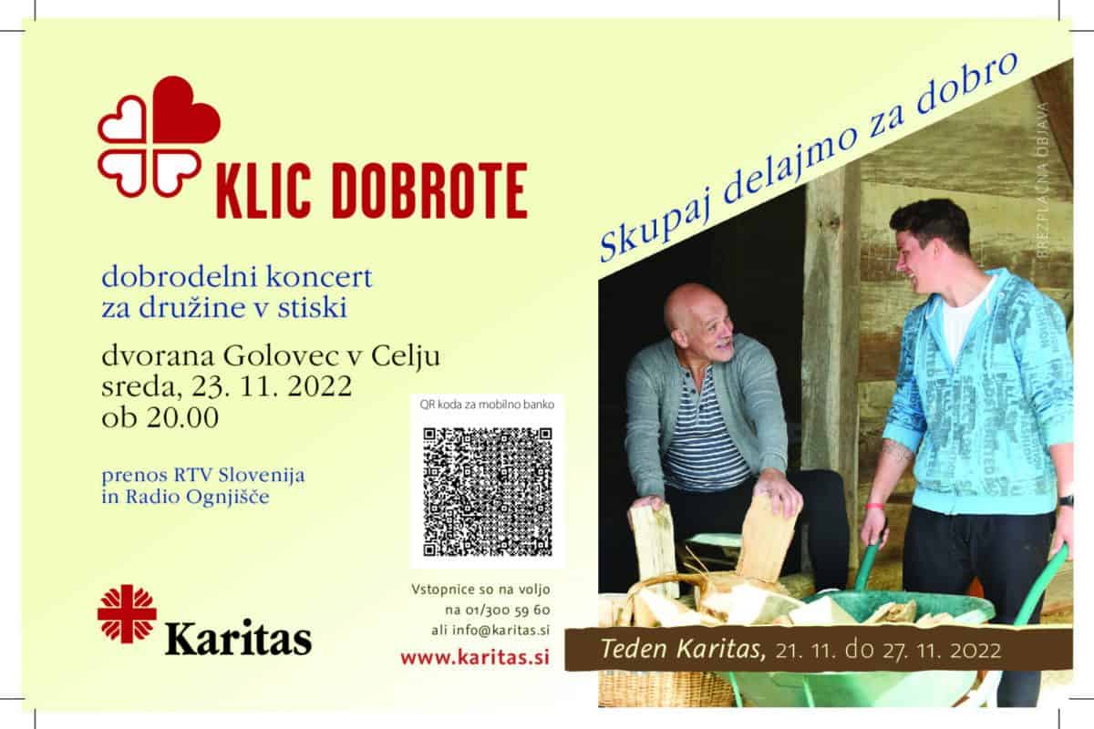 "Družine najprej potrebujejo osnovno pomoč s hrano, plačilom položnic, kurjavo in higienskimi pripomočki. To jim lahko zagotovimo predvsem z vašimi darovi, ki jih bomo zbrali s Klicem dobrote," so v sporočilu za javnost navedli organizatorji koncerta.