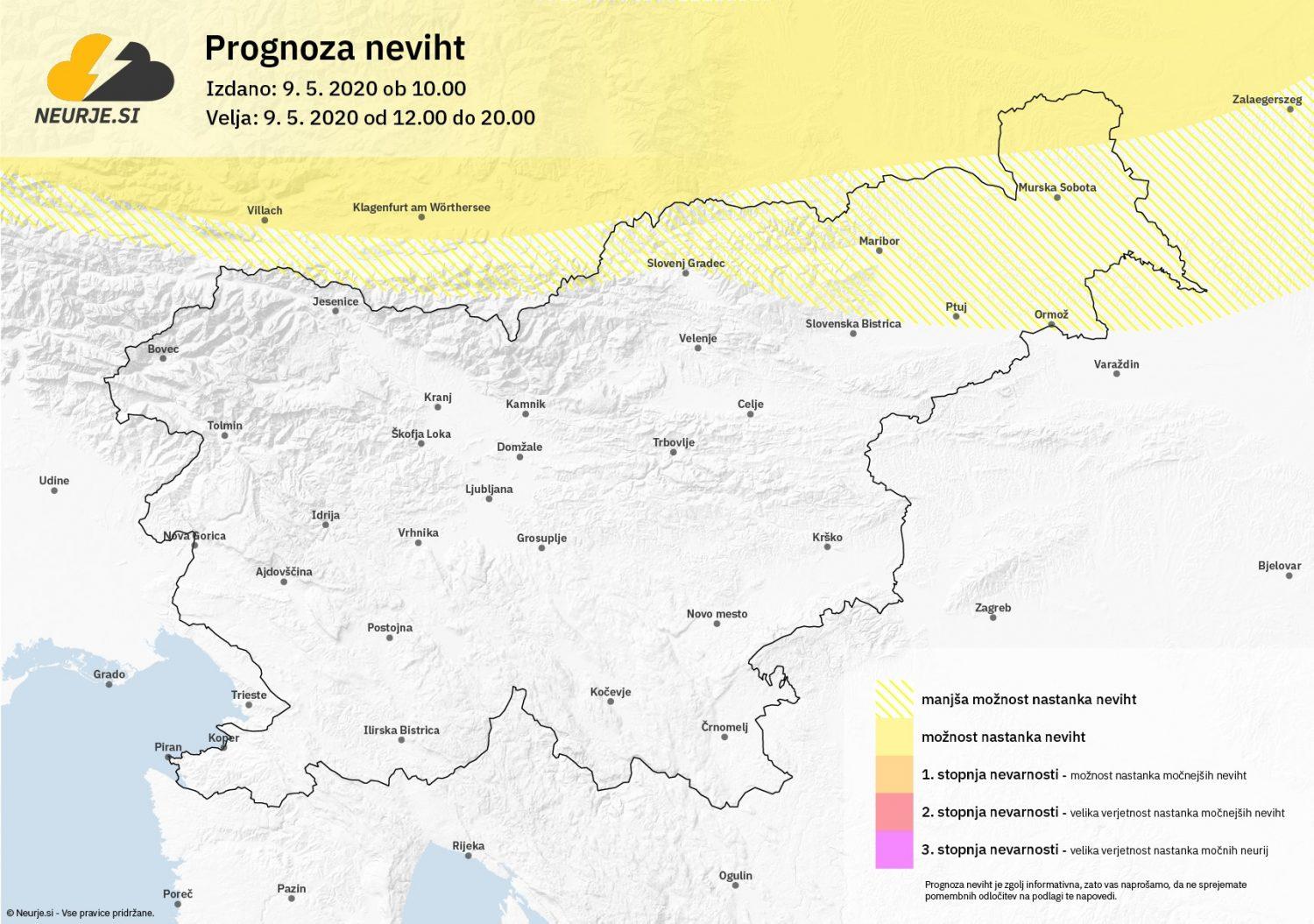 Največ verjetnosti za nastanek kakšne nevihte pri nas bo na Goričkem. Ostanki posameznih neviht iz Avstrije bodo najverjetneje dosegli tudi del Štajerske, Koroške in Prekmurja. Ob tem so ponekod možne manjše plohe.
