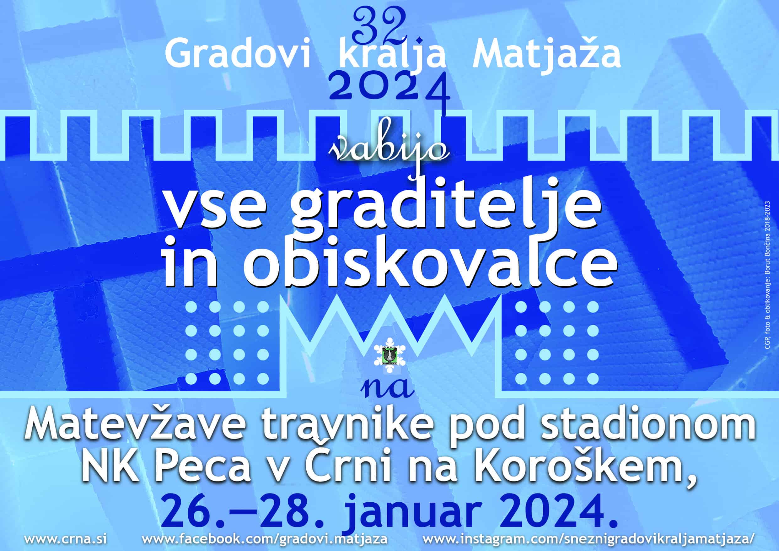 v Črni na Koroškem. Vse kar potrebujete za udeležbo je dobra volja, dobra družba, topla oblačila in orodje za izdelavo gradov oz. skulptur. Vse graditelje čakajo izjemno privlačne nagrade (oddih na otoku hrvaškem otoku Šolta, spusti po jeklenici Olimpline, ogled Podzemlja Pece z vlakcem in kajakom, darilni boni za doživetja v Geoparku Karavanke, tradicionalna splavarska rajža s splavarsko malico v družbi Koroških splavarjev na Dravi ter mnoge druge ...).