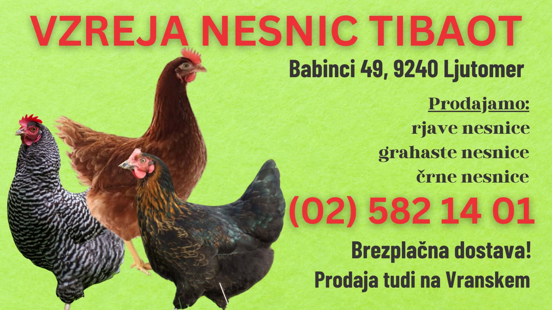 Kmetija Tibaot iz Ljutomera, ki se ponaša z več kot 30-letno tradicijo, prodaja kokoši nesnice po ugodni ceni in z brezplačno dostavo po vsej Sloveniji. Novost letošnje ponudbe je tudi prodaja na Vranskem.
