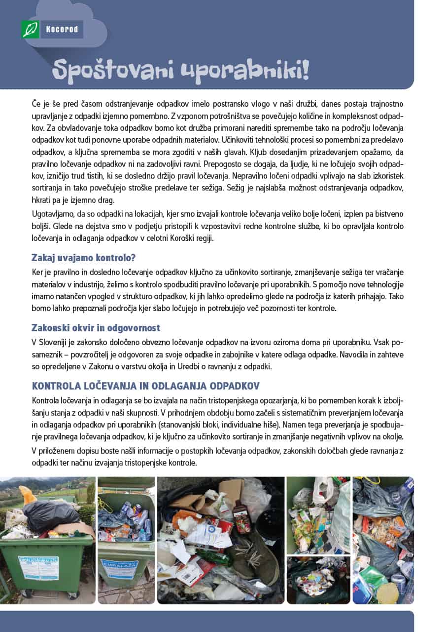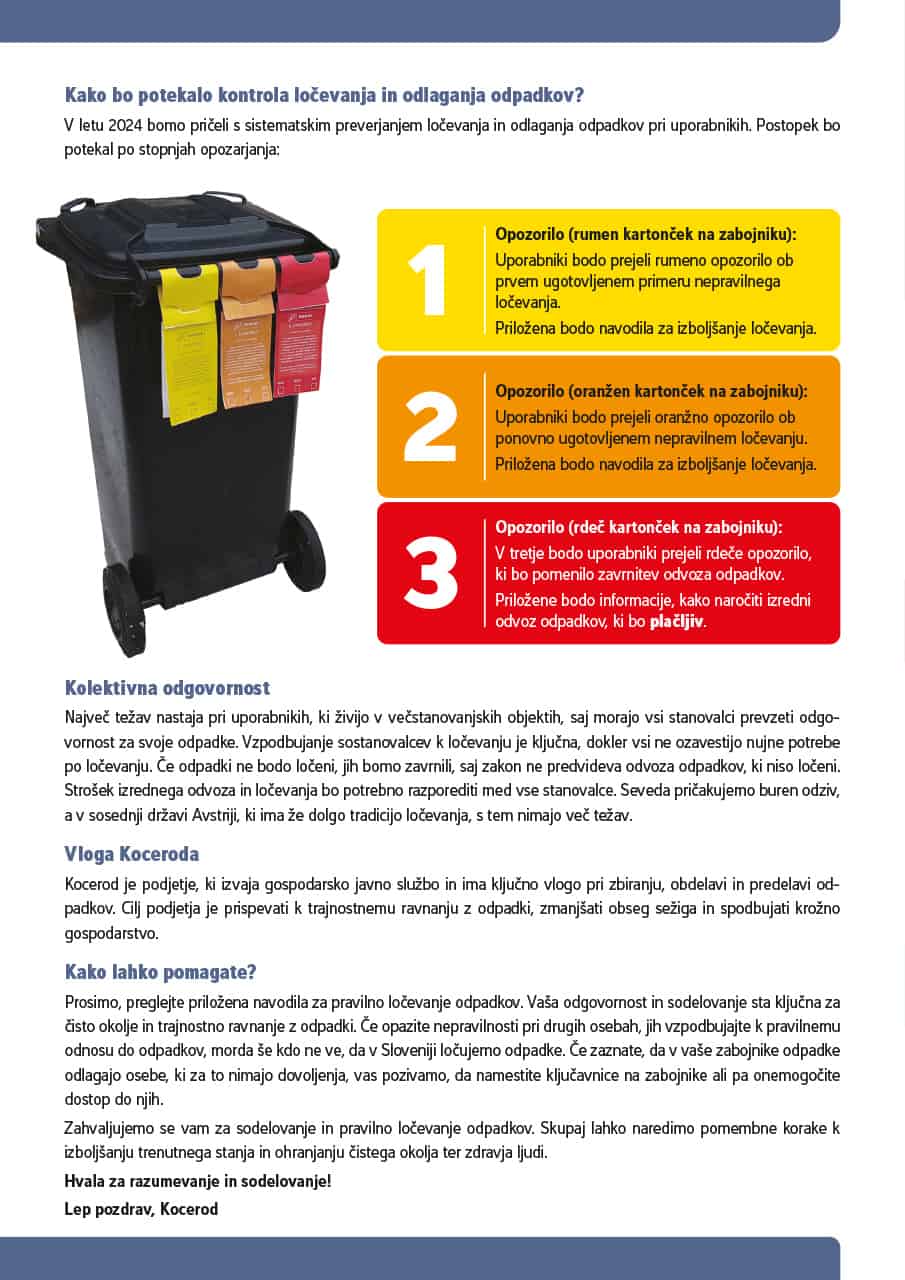 Kot so včeraj, 31. januarja 2024, sporočili s podjetja Kocerod, družbe za ravnanje z odpadki, uvajajo s februarjem 2024 večji nadzor nad ločevanjem odpadkov. S tem mesecem namreč uvajajo kontrolno službo, ki bo preverjala pravilno ločevanje odpadkov pri uporabnikih, dokler se uporabnikov ne ozavesti o potrebi po ločevanju in pravilnem odlaganju odpadkov. Sporočili so, da bodo gospodinjstva v februarju prejeli informacije tudi na dom.