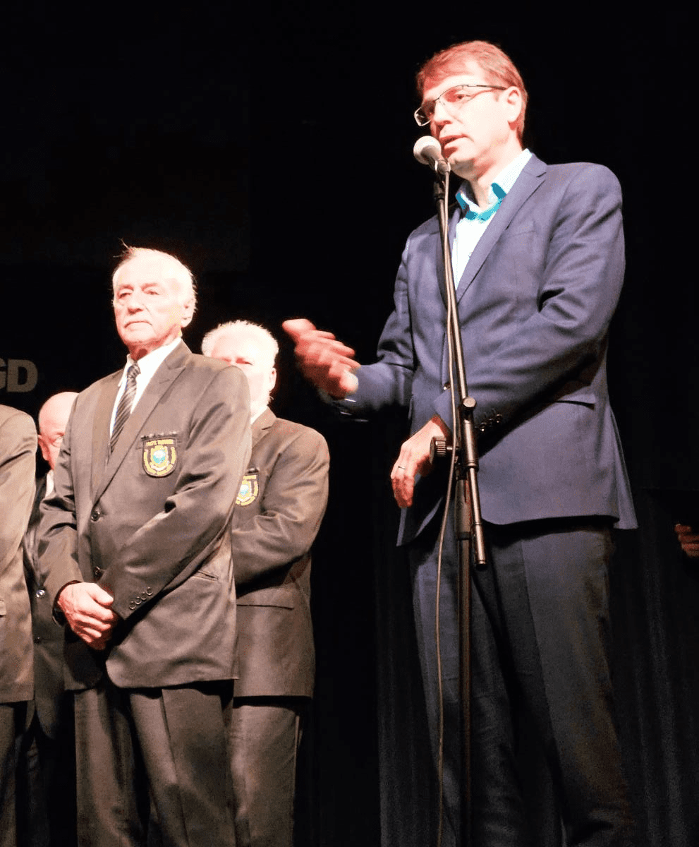 Preden se je začel slavnostni koncert, je župan Občine Ravne na Koroškem dr. Tomaž Rožen pozdravil večerno srečanje in izrekel čestitke slavljencem ob častitljivem jubileju.