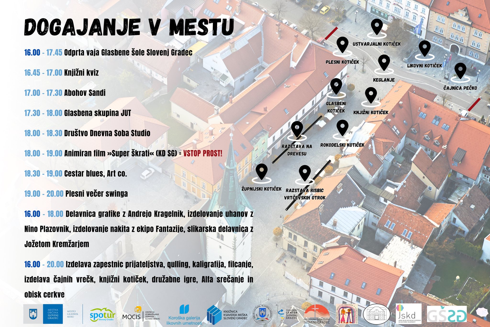 Obiskovalci bodo lahko tokrat doživeli mestno jedro skozi knjižni sejem, odprto vajo glasbenikov, otroške pravljične urice, likovne in rokodelske ustvarjalnosti ter sproščene ulične aktivnosti. Med drugim bo omogočen brezplačen vstop v mestni kino, plesni nastop članov KD Swingradec in odkrivanje mesta skozi manj pričakovane, a posebne izkušnje.