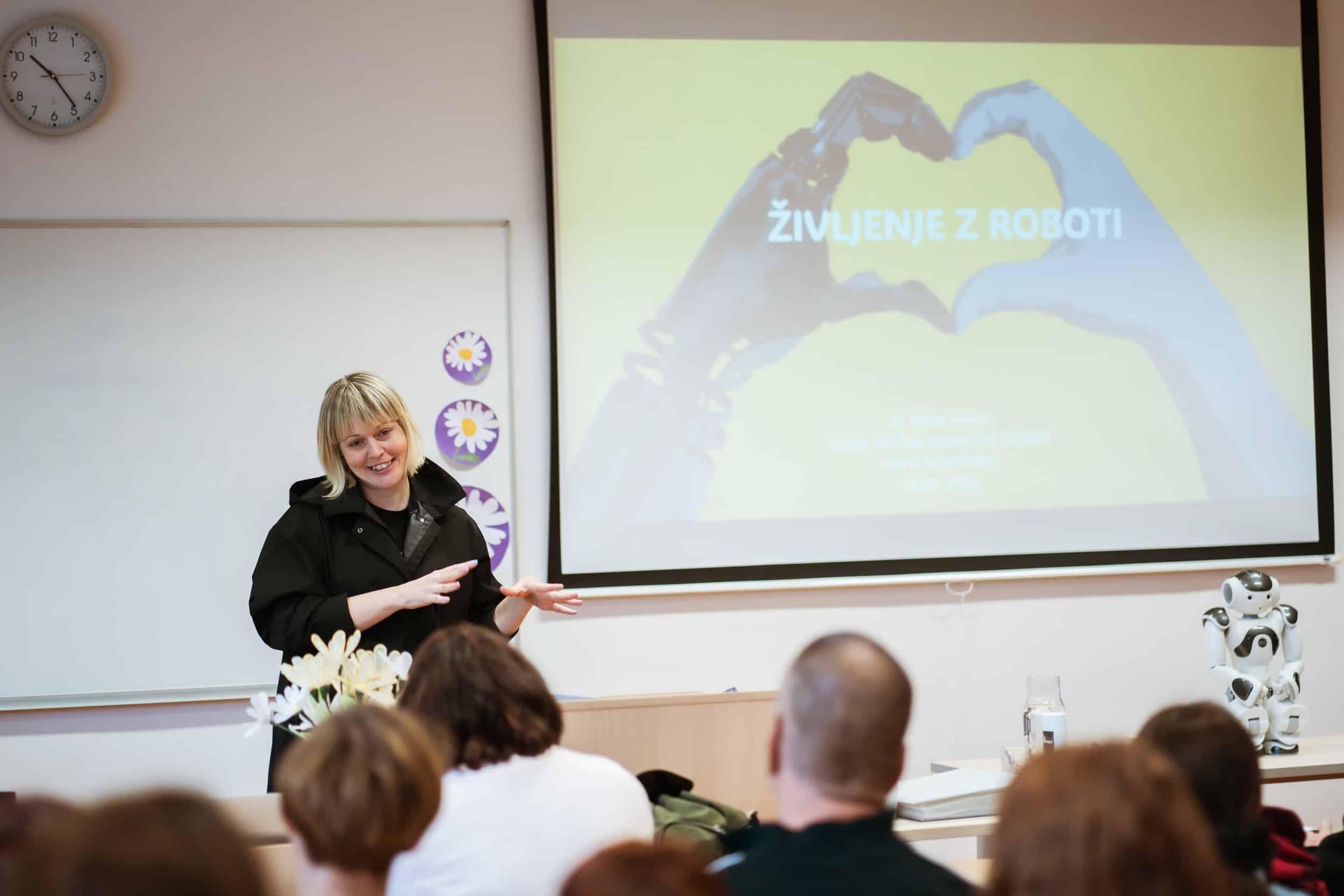 Tega vsekakor ni mislila slabšalno, saj jim je posvetila velik del svoje profesionalne kariere in osebnega poslanstva. Maša Jazbec je umetnica, akademska raziskovalka, kuratorka in producentka, ki se udejstvuje na različnih področjih, kjer se stikata znanost in umetnost. V svojem večplastnem ustvarjanju se posveča predvsem vplivu robotike in ostalih sodobnih tehnologij na življenja ljudi in ostalih živih organizmov. Z njenim interaktivnim predavanjem »Kakšno prihodnost si predstavljate z roboti?« so tudi otvorili letošnje Tedne vseživljenjskega učenja v Slovenj Gradcu, ki je potekalo v prostorih Fakultete za tehnologijo polimerov. »Raziskovanje interakcije med človekom in robotom združuje znanost strojništva in humanistike, kognitivne znanosti, nevroznanosti, etike in umetnosti. Ljudje se nenavadno odzivajo na stvari, ki dajejo videz živega, a so nežive. Robotika je vsaj toliko veda o robotih, kot je to veda o ljudeh. Od nas zahteva, da razvijemo uvid v novo in dinamično, spreminjajoče se razmerje med človekom in pametnimi stroji. Z ustvarjanjem robotov razmišljamo o človeku in posledično nam to omogoča, da bolje razumemo človeško vrsto. Učenje na podlagi človeškega vedenja je nujno potrebno za razvoj robotov v vsakdanjem življenju«, je med predavanjem povedala dr. Maša Jazbec. Obiskovalci so lahko doživeli bližnji in pristen stik z roboti, ki so jih lahko tudi preizkusili.