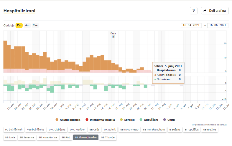 Po zadnjih podatkih Covid-19 sledilnika v Splošni bolnišnici Slovenj Gradec ne zdravijo nobenega covidnega pacienta. Nazadnje so imeli hospitaliziranega bolnika s potrjeno okužbo v soboto, 5. junija 2021.
