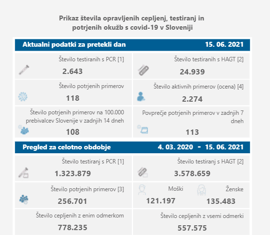 Število opravljenih testiranj in število potrjenih okužb s covidom-19 do vključno 15. 6. 2021: