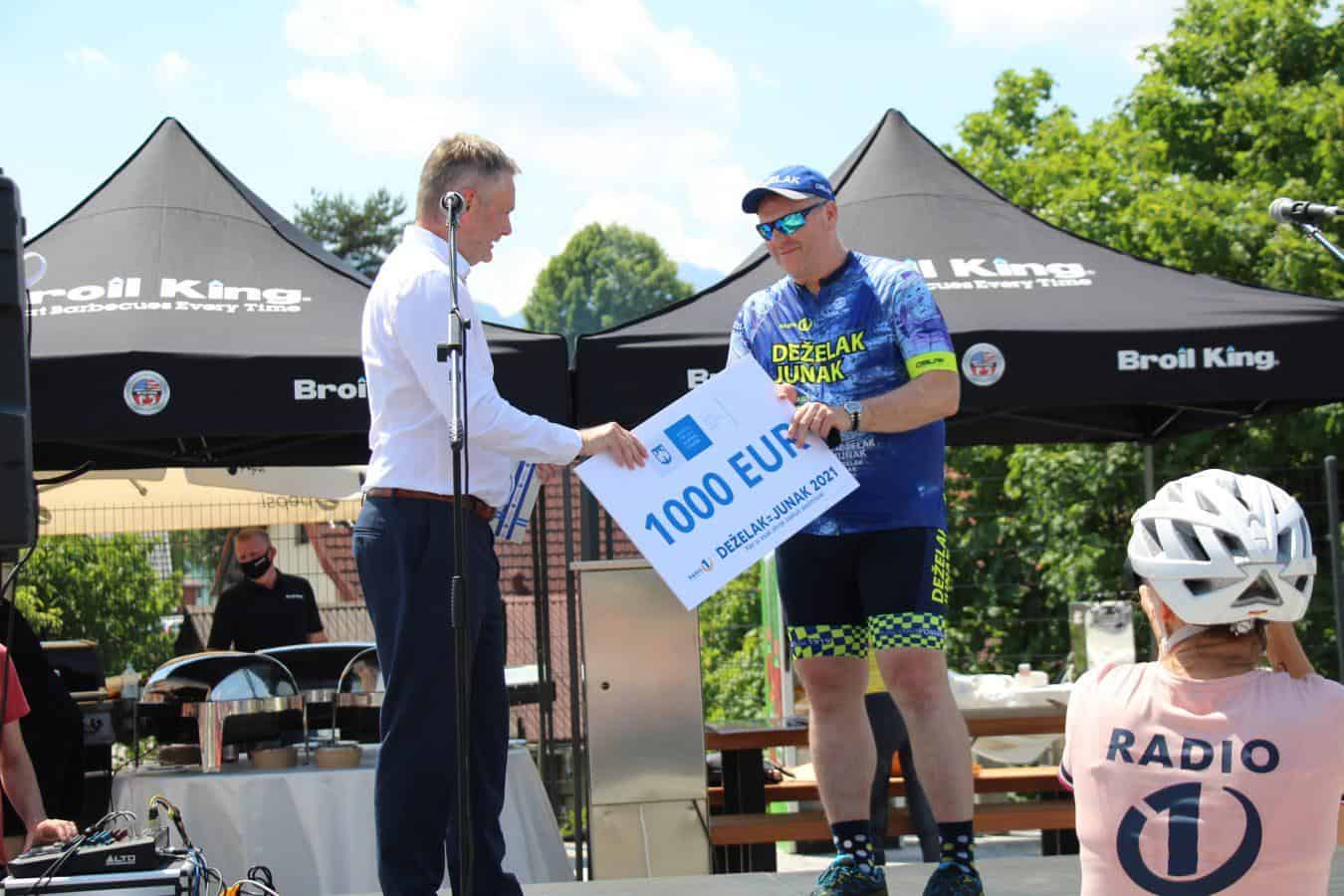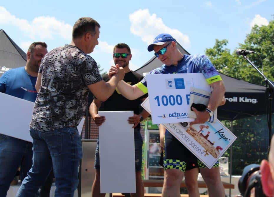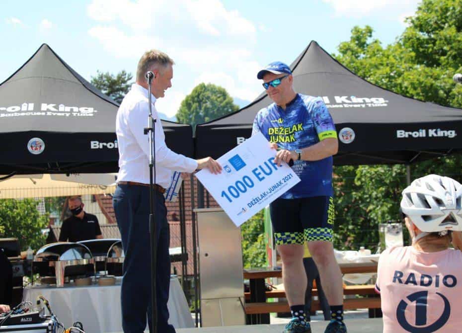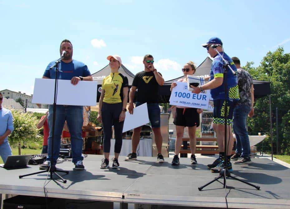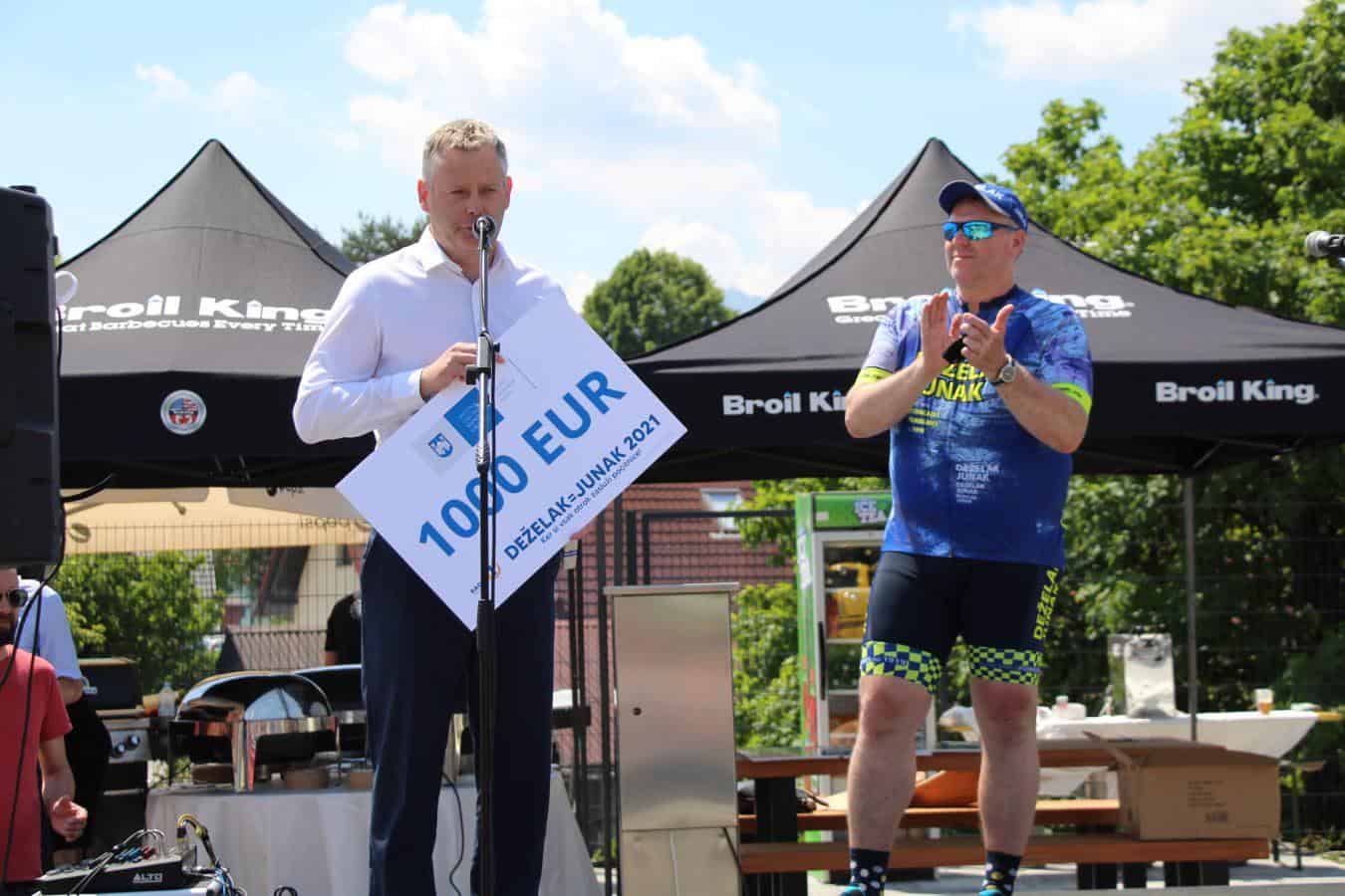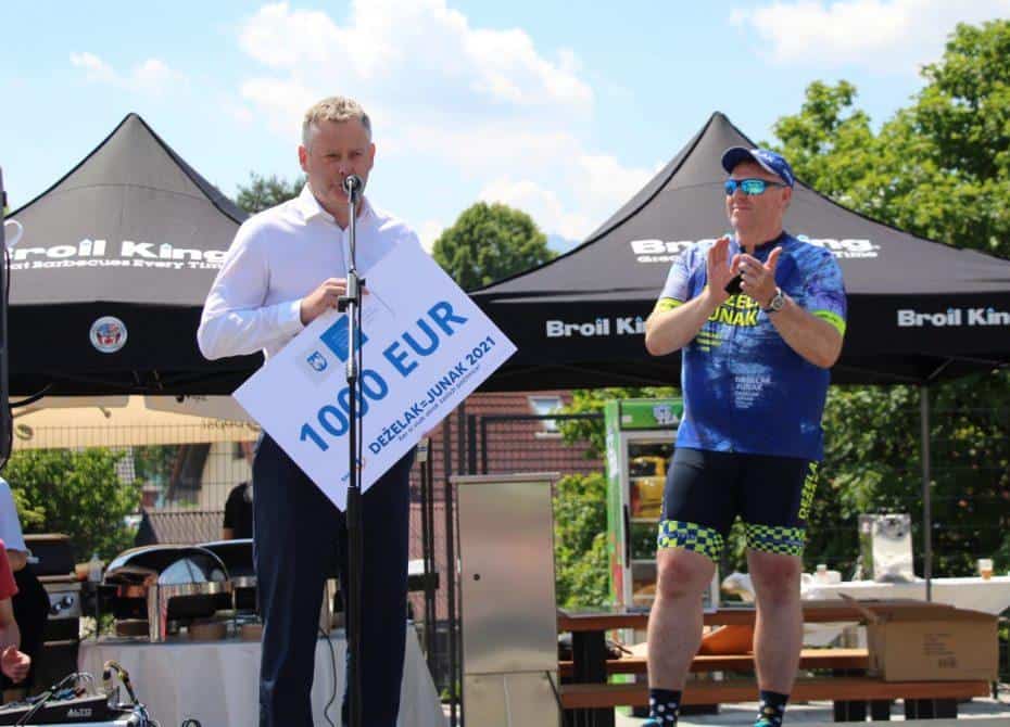 Velik sprejem za junaka, ki zbira sredstva za otroke so pripravili tudi v Slovenj Gradcu. Pričakali so ga otroci iz osnovne sole, predstavniki občine, tudi slovenjgraški župan Tilen Klugler. Direktor podjetja Vabo Boštjan Paradiž je Deželaku podaril bon v imenu smučišča Kope, svoj delež so med prispevali tudi center Rovando in Gralprint. Bon v vrednosti tisoč evrov pa je Deželaku v imenu občine predal tudi slovenjgraški župan Klugler.