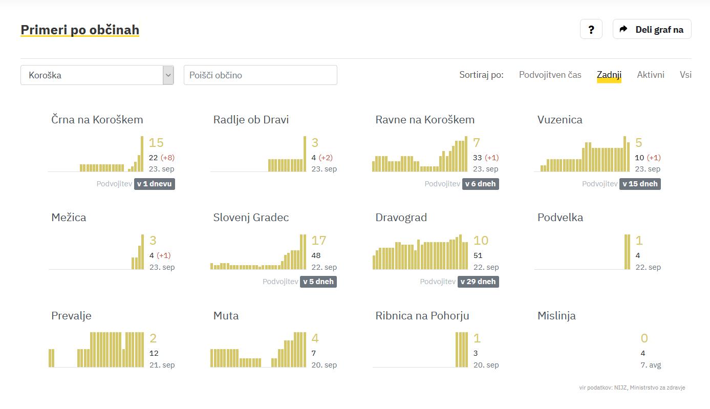 Nove pozitivne primere so potrdili v Črni na Koroškem (+8), Radljah ob Dravi (+2), na Ravnah na Koroškem (+1) ter v Vuzenici (+1) in Mežici (+1).