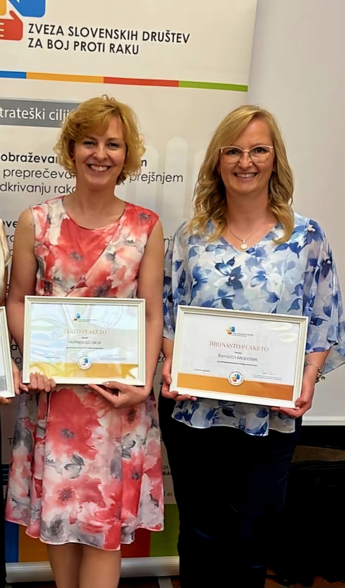 Zlato priznanje je šlo v roke sodelavke ZD Slovenj Gradec, Mateje Učakar, t zahvalo za več kot 15 let neprecenljivega prostovoljnega dela, vztrajnega prizadevanja in neomajne predanosti preventivi raka ter promociji zdravega načina življenja. Njeno dolgoletno delovanje v Društvu za boj proti raku je pomembno prispevalo k uresničevanju vizije družbe brez raka – družbe, v kateri se posamezniki zavedajo pomena preventive, rednih pregledov, cepljenja proti HPV in zdravega življenjskega sloga.