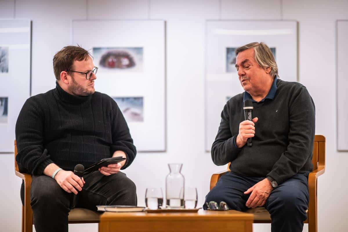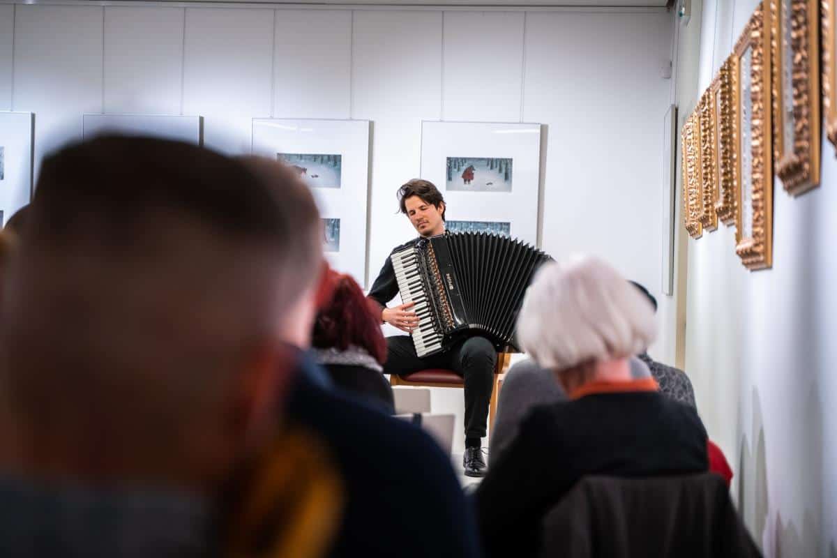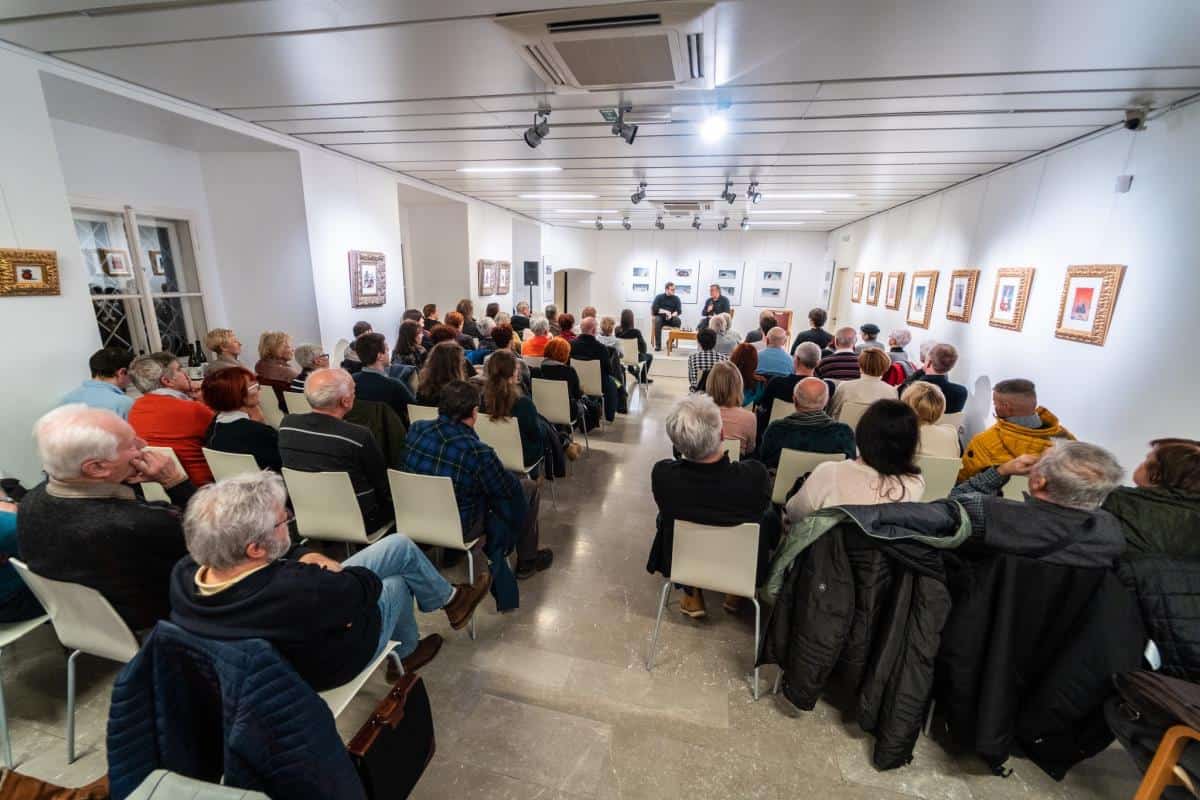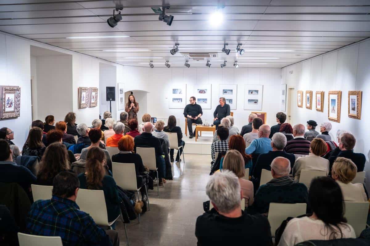 Pogovor z njim je vodil celjski knjižničar, pesnik in pedagog Kristian Koželj. Za glasbeno kuliso je v razstavišču knjižnice poskrbel harmonikarski virtuoz Žiga Vehovec.