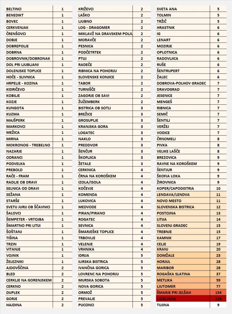 LJUBLJANA - V Sloveniji so v torek opravili 1288 testov za novi koronavirus. Potrjenih je bilo 39 primerov okužbe, kar pomeni, da se je število ljudi s potrjeno okužbo povzpelo na 841. Zaradi covida-19 je hospitaliziranih 119 bolnikov, od teh jih je 31 na intenzivni negi. Dve osebi sta v torek umrli, je objavila vlada. Skupno število umrlih zaradi novega koronavirusa je bilo tako v torek ob koncu dneva 15. Med okuženimi je 110 zdravstvenih delavcev.