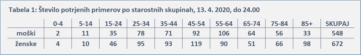 Po podatkih NIJZ je bilo do 31.3.2020 do 24. ure je bilo opravljenih 23.762 testiranj, od tega je bilo 855 pozitivnih testov.