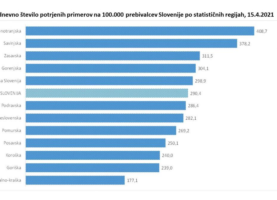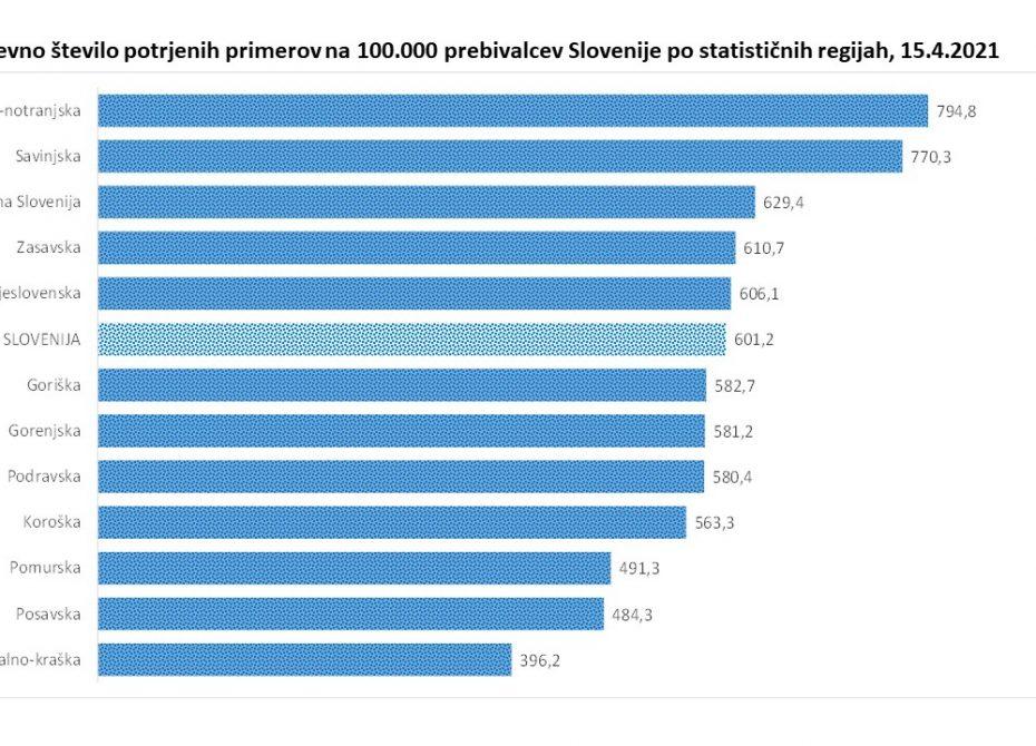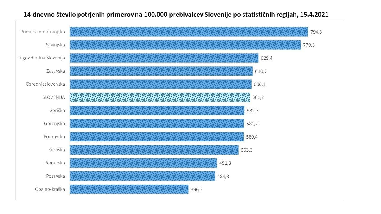 Na grafu, ki prikazuje 14-dnevno incidenco po statističnih regijah imata najvišji incidenci primorsko-notranjska regija (795) in savinjska regija (770), najnižji incidenci pa sta v posavski regiji (484) in obalno-kraški regiji (396). 7-dnevna incidenca na nivoju države znaša 290, včeraj je znašala 310. Koroška regija je po 7-dnevni incidenci na tretjem mestu (240,0).