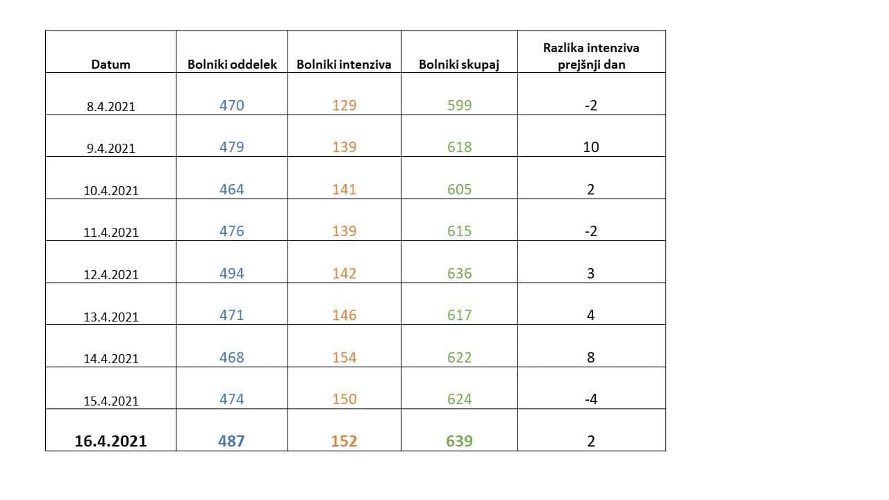 V bolnišnicah se danes zdravi 639 pacientov, kar je 15 več kot včeraj. Na intenzivni terapiji se danes zdravi 152 pacientov, kar je za 2 več kot včeraj. Umrlo je 5 oseb s potrjeno okužbo.