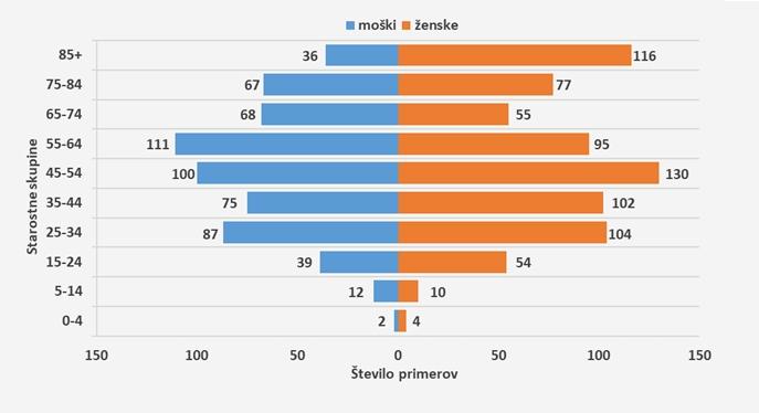 V spodnji tabeli je prikazano skupno število primerov ter število novih primerov in razporeditev po spolu.