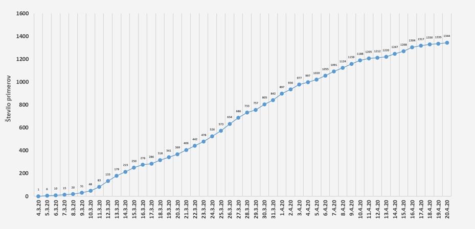 Po podatkih NIJZ je bilo do 20. 4. 2020 do 24. ure opravljenih 42.976 testiranj1, od tega je bilo 1355 pozitivnih testov.