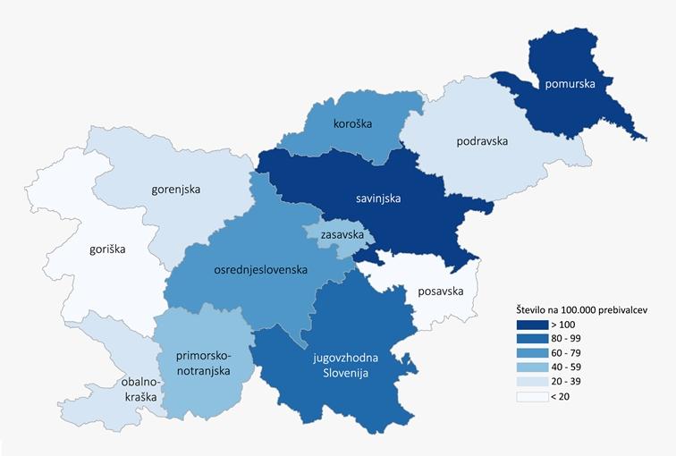 Število potrjenih primerov COVID-19 na 100.000 prebivalcev po statističnih regijah bivanja do vključno 20. 4. 2020