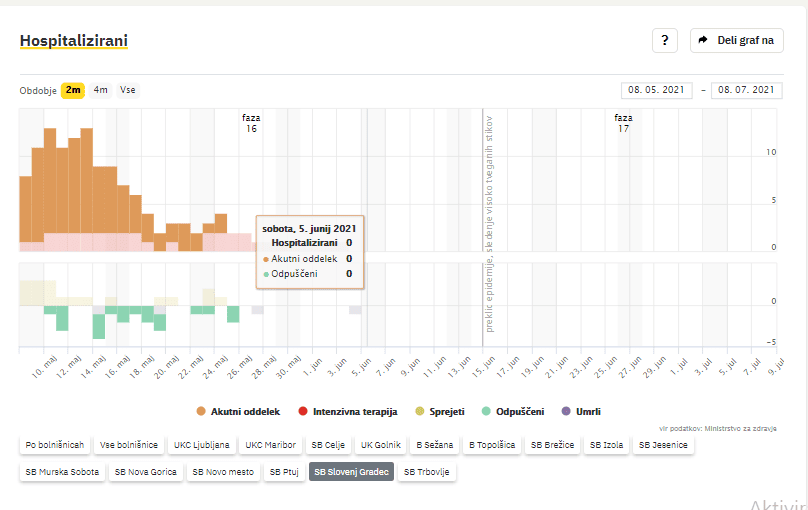 Po zadnjih podatkih Covid-19 sledilnika v Splošni bolnišnici Slovenj Gradec ne zdravijo nobenega covidnega pacienta. Nazadnje so imeli hospitaliziranega bolnika s potrjeno okužbo v soboto, 5. junija 2021.