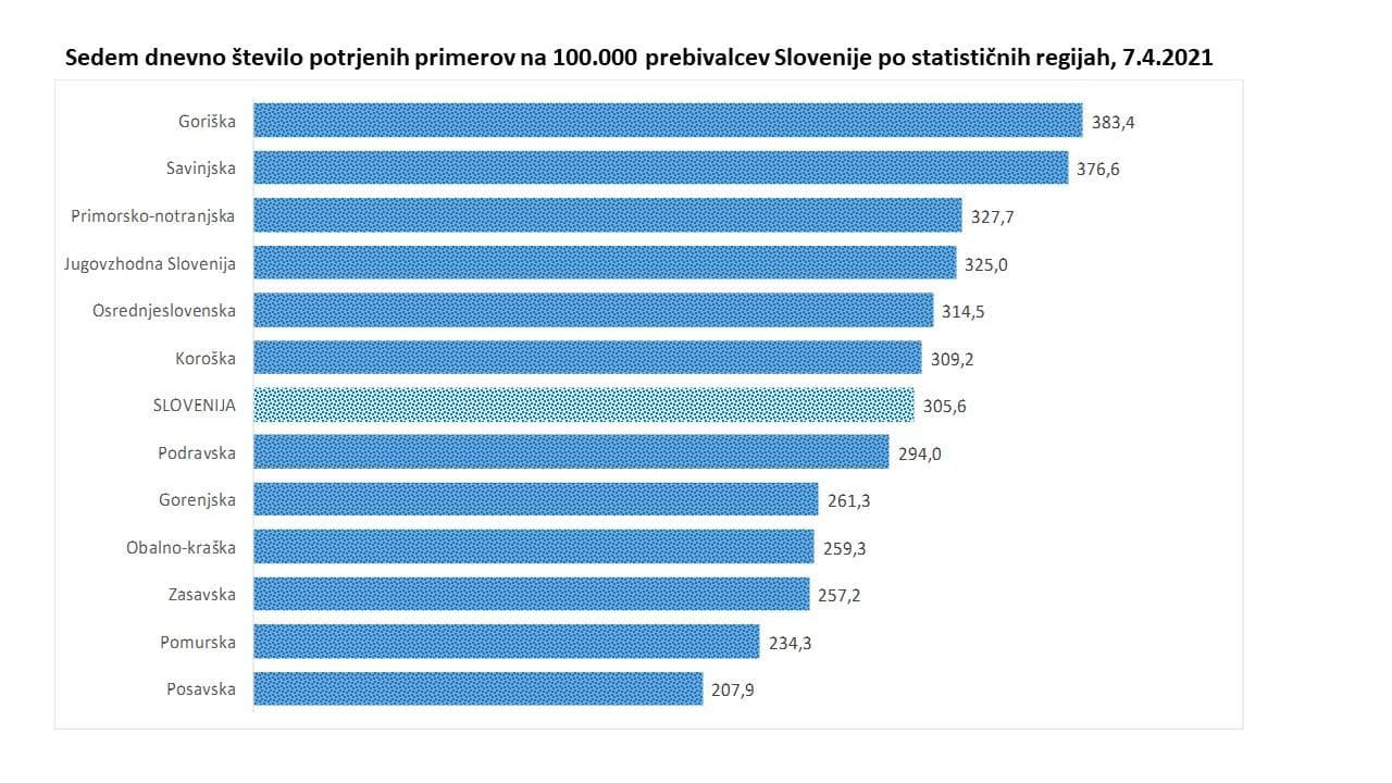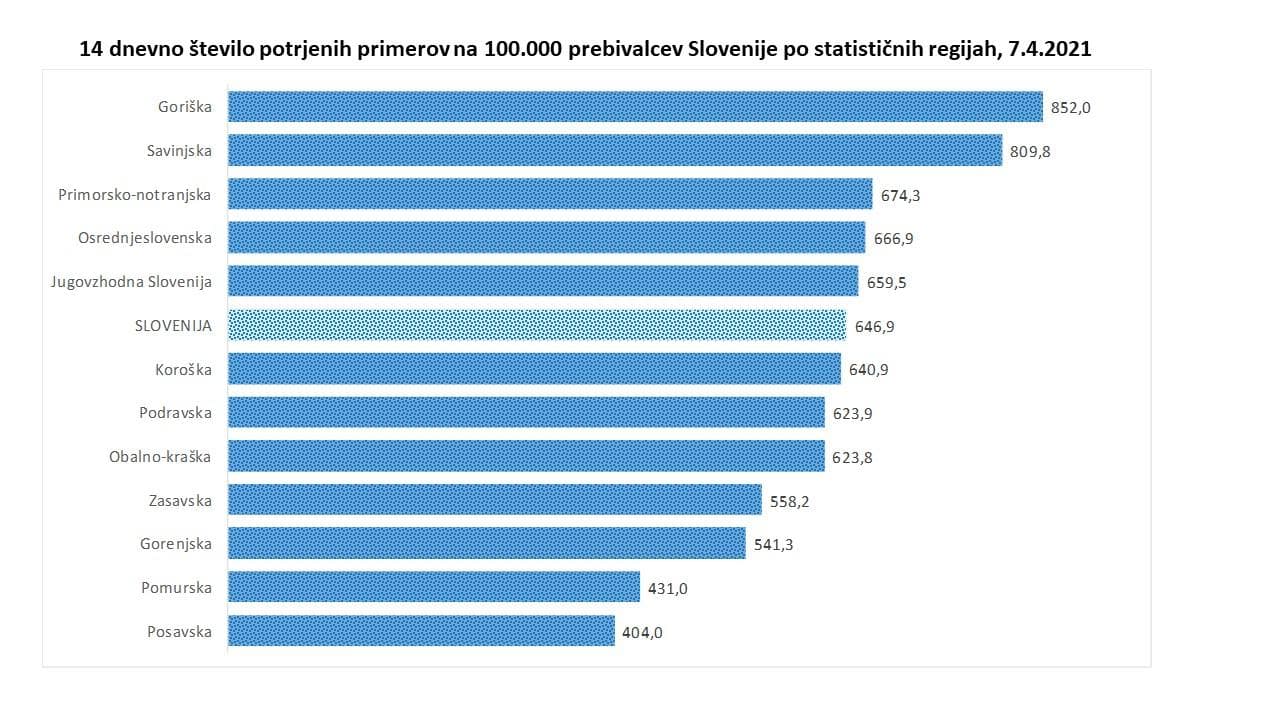 7 dnevno povprečje okužb je po danes objavljenih podatkih NIJZ vnovič višje in sicer danes znaša 917, včeraj je bilo 889. Na ravni države 14-dnevna incidenca znaša 646,9, 7-dnevna incidenca pa 305,6. 7-dnevna incidenca znaša 305,6 in tudi pri tej ima najslabše razmere goriška regija, najboljše pa so v zasavski, posavski in pomurski.