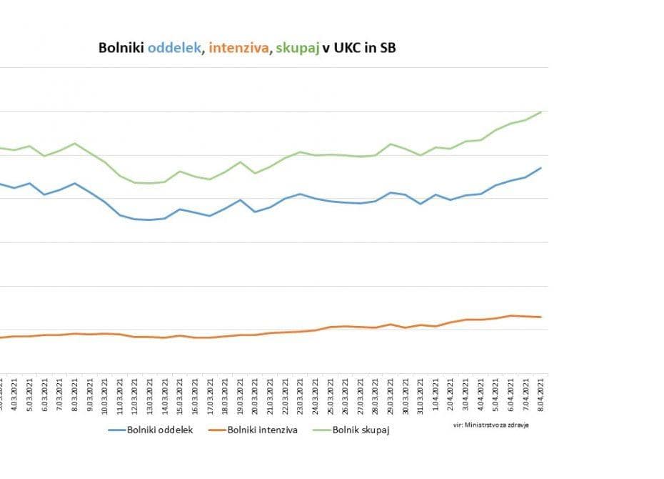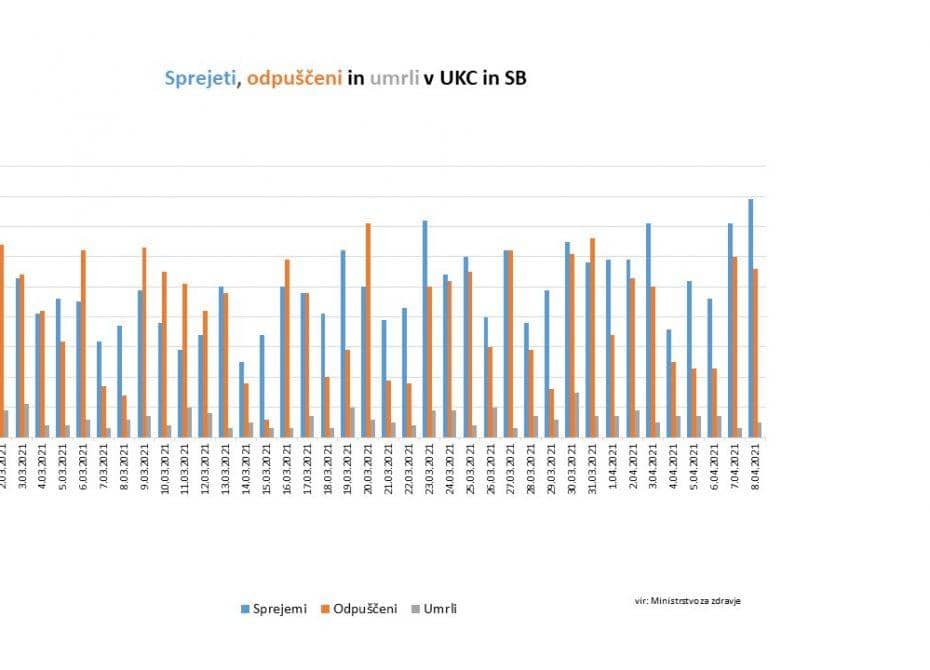 Bolnišnično oskrbo danes potrebuje 599 covidnih pacientov. Na intenzivni negi se trenutno zdravi 129 pacientov. Skupaj je bilo v bolnišnice včeraj sprejetih 79 pacientov, 56 pa jih je bilo odpuščenih. Včeraj je umrlo 5 oseb s potrjeno okužbo.