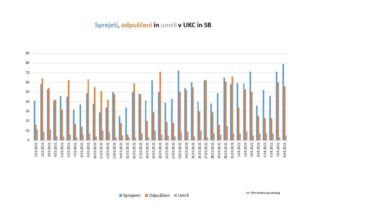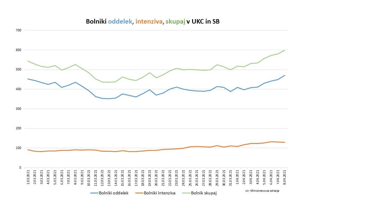Bolnišnično oskrbo danes potrebuje 599 covidnih pacientov. Na intenzivni negi se trenutno zdravi 129 pacientov. Skupaj je bilo v bolnišnice včeraj sprejetih 79 pacientov, 56 pa jih je bilo odpuščenih. Včeraj je umrlo 5 oseb s potrjeno okužbo.