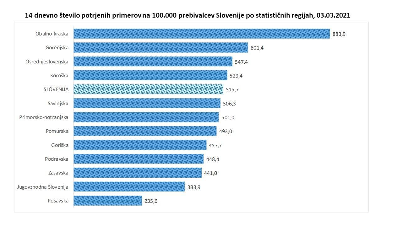 Podatki o 14-dnevni incidenci so danes slabši za vse regije razen za štiri, in sicer za primorsko-notranjsko, podravsko, jugovzhodno in posavsko regijo. Obalno-kraška regija še naprej ostaja rdeče obarvana. Danes objavljeni podatki kažejo, da se je sedem dnevno povprečno število potrjenih okužb v tej regiji še nekoliko povečalo – danes 75, včeraj 71, je navedla vladna govorka Maja Bratuša.