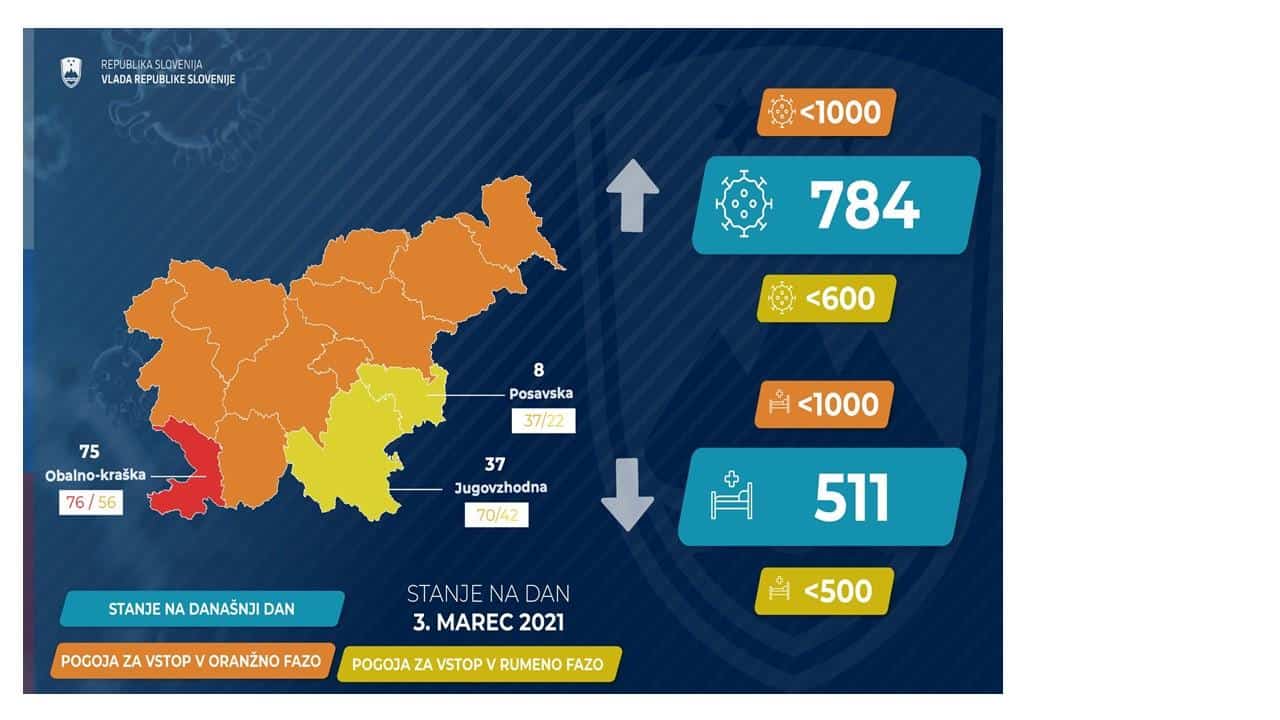 Vlada se je tudi ta teden seznanila z epidemiološkimi razmerami in po posvetovanju s svetovalno skupino ministrstva za zdravje odločila, da v skladu z načrtom sproščanja še vedno ostajamo v oranžni fazi. Je pa vlada glede na podatke v sredo odločila, da so v dveh regijah, jugovzhodni Sloveniji in posavski regiji, trenutne epidemiološke razmere takšne, da omogočajo prehod v rumeno fazo.