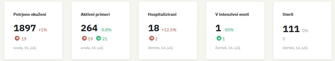 Skupno so v Sloveniji tako potrdili že 1897 okužb z novim koronavirusim. V sredo je bilo hospitaliziranih 18 bolnikov s covidom-19, kar sta dva več kot dan prej. Intenzivno zdravljenje potrebuje en bolnik, v domačo oskrbo pa niso odpustili nobene osebe. V sredo ni umrl noben bolnik s covidom-19, je še sporočila vlada.