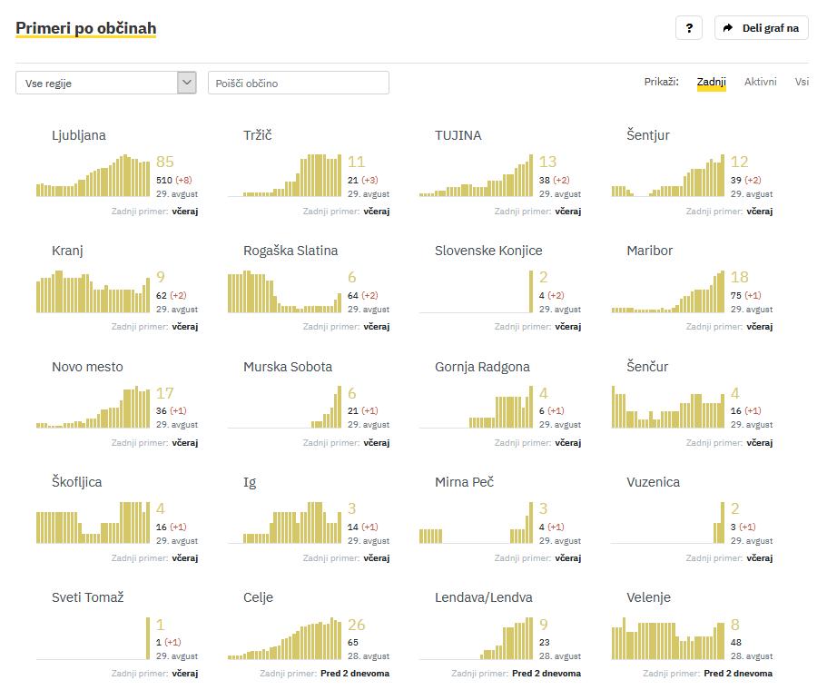 Skupno število okuženih je sicer naraslo na 2865, število aktivnih primerov okužb pa je bilo 449. Okužbe so v soboto sicer potrdili v 16 občinah, od tega največ, osem, v Ljubljani, še izhaja iz podatkov omenjenega sledilnika.