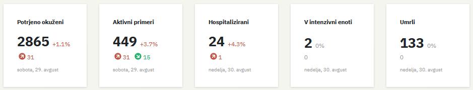Trend obolelosti s koronavirusom v Slovenijiin podatki za dan 29. 8. 2020 (00:00–24:00):