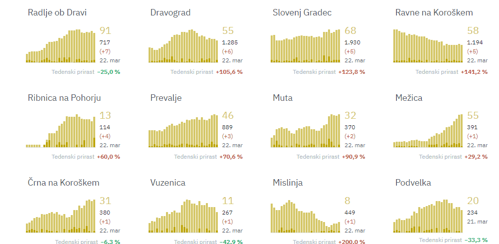 Radlje ob Dravi 7, Dravograd 6, Slovenj Gradec 5, Ravne na Koroškem 5, Ribnica na Pohorju 4, Prevalje 3, Muta 2, Mežica 1, Črna na Koroškem 1, Vuzenica 1, Mislinja 1.
