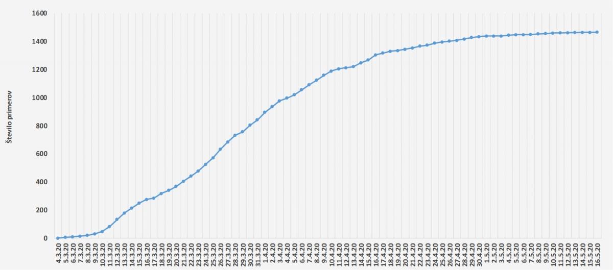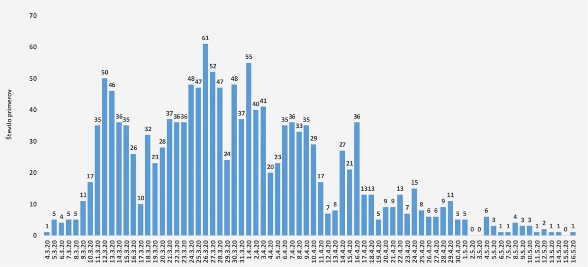 V spodnjem izpisu je prikazano število opravljenih testiranj in število prijavljenih primerov okužb s COVID-19 v Sloveniji do vključno 16. 5. 2020.