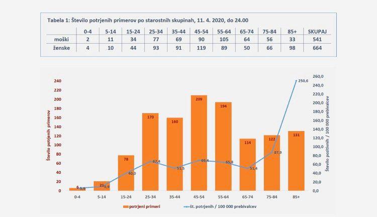 Med COVID-19 pozitivnimi je 541 moških in 664 žensk, skupno 1205 oseb. Pozitivni primeri COVID-19 so po starostnih skupinah predstavljeni v Tabeli 1.