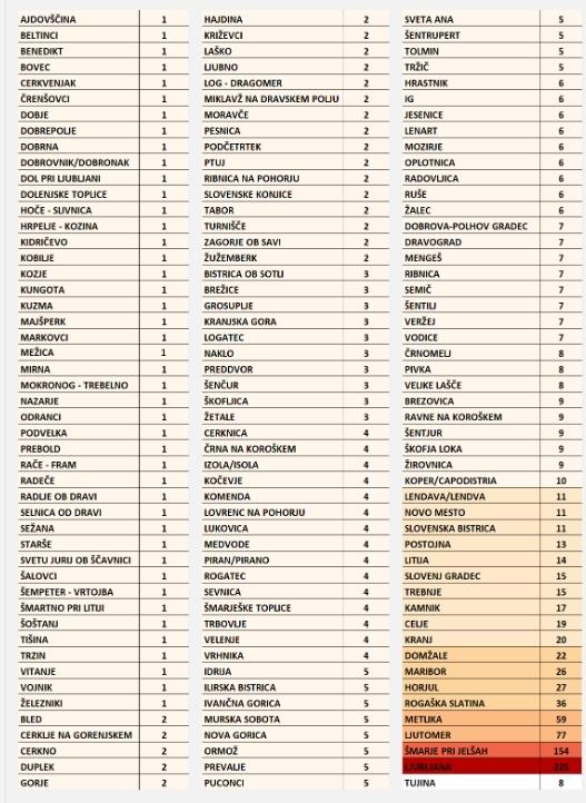 Do 11. 4. 2020 (do 24.00) je bil vsaj en primer okužbe COVID-19 potrjen v 146 občinah (69 % vseh slovenskih občin), več kot dva primera okužbe COVID-19 sta bila potrjena v 102 občinah.