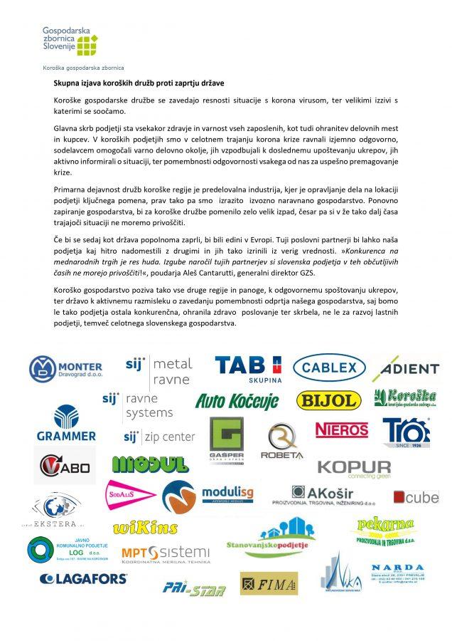 "Če bi se sedaj kot država popolnoma zaprli, bi bili edini v Evropi. Tuji poslovni partnerji bi lahko naša podjetja kaj hitro nadomestili z drugimi in jih tako izrinili iz verig vrednosti. »Konkurenca na mednarodnih trgih je res huda. Izgube naročil tujih partnerjev si slovenska podjetja v teh občutljivih časih ne morejo privoščiti!«, poudarja Aleš Cantarutti, generalni direktor GZS. Koroško gospodarstvo poziva tako vse druge regije in panoge, k odgovornemu spoštovanju ukrepov, ter državo k aktivnemu razmisleku zavedanju pomembnosti odprtja našega gospodarstva, saj bomo le tako podjetja ostala konkurenčna, ohranila zdravo poslovanje ter skrbela, ne le za razvoj lastnih podjetji, temveč celotnega slovenskega gospodarstva."