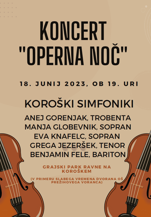 V nedeljo, 18. junija 2023, ob 19. uri bo v Grajskem parku na Ravnah na Koroškem potekal koncert Koroških simfonikov. Poimenovali so ga "Operna noč".