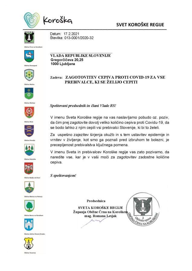 "V imenu Sveta Koroške regije na vas naslavljamo pobudo oz. poziv, da čim prej zagotovite dovolj veliko količino cepiva proti Covidu-19, da se bodo lahko z njim cepili vsi prebivalci Slovenije, ki bi to želeli," je v imenu koroških županov v zapisu vladi navedla predsednica Sveta Koroške regije, županja mag. Romana Lesjak.