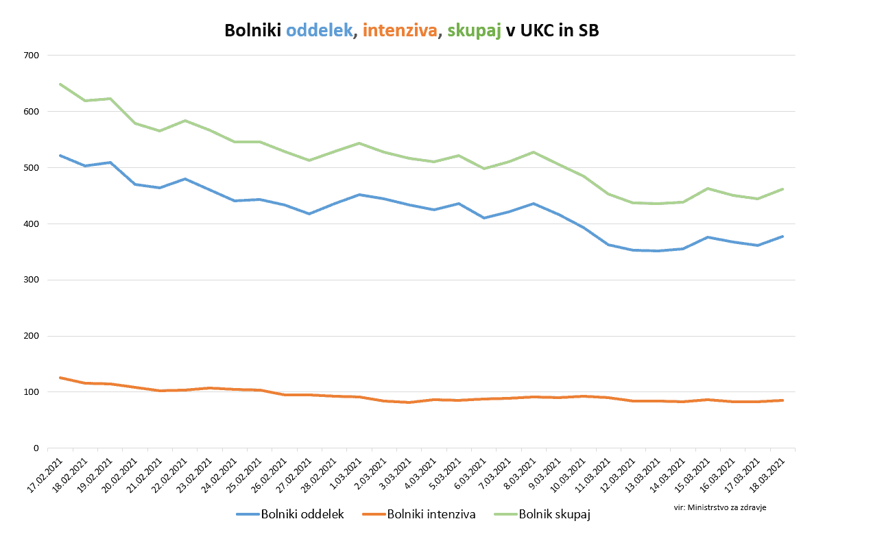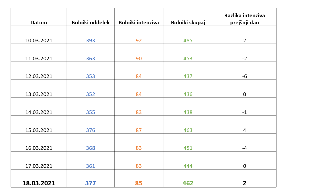 Tudi podatki o zasedenosti bolniških postelj so danes slabši. V bolnišnicah se danes zdravi 462, včeraj 444. Na intenzivni terapiji se zdravi 58 covidnih pacientov. Skupaj je bilo včeraj v bolnišnice sprejetih 41 oseb, iz njih pa je bilo včeraj skupaj odpuščenih 20 oseb. Umrle so tri osebe.