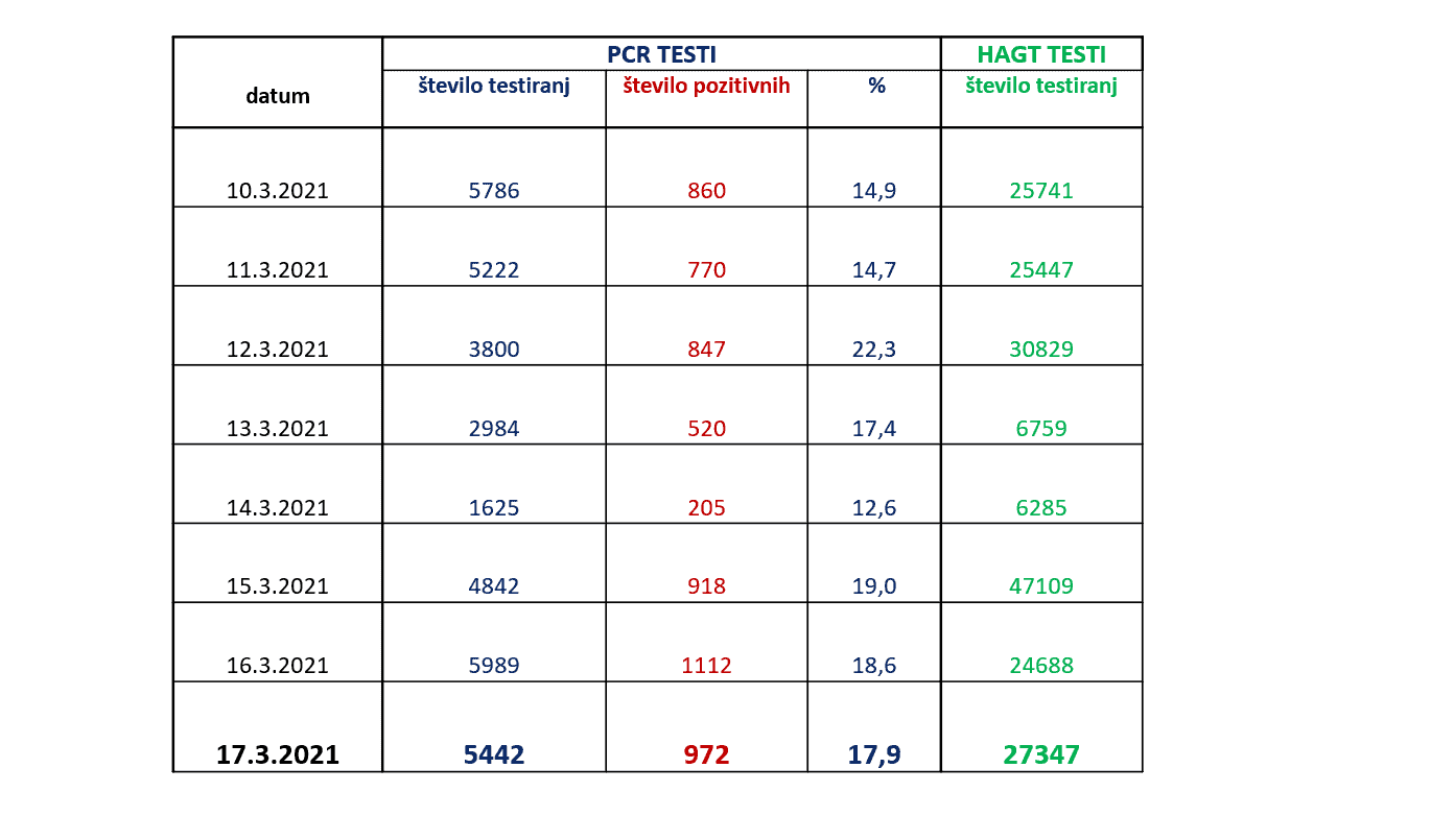 Včeraj je bilo opravljenih 5.442 PCR testov in 27.347 hitrih antigenskih testov. S PCR testi je bilo včeraj potrjenih 972 novih okužb, je pojasnila vladna govorka.