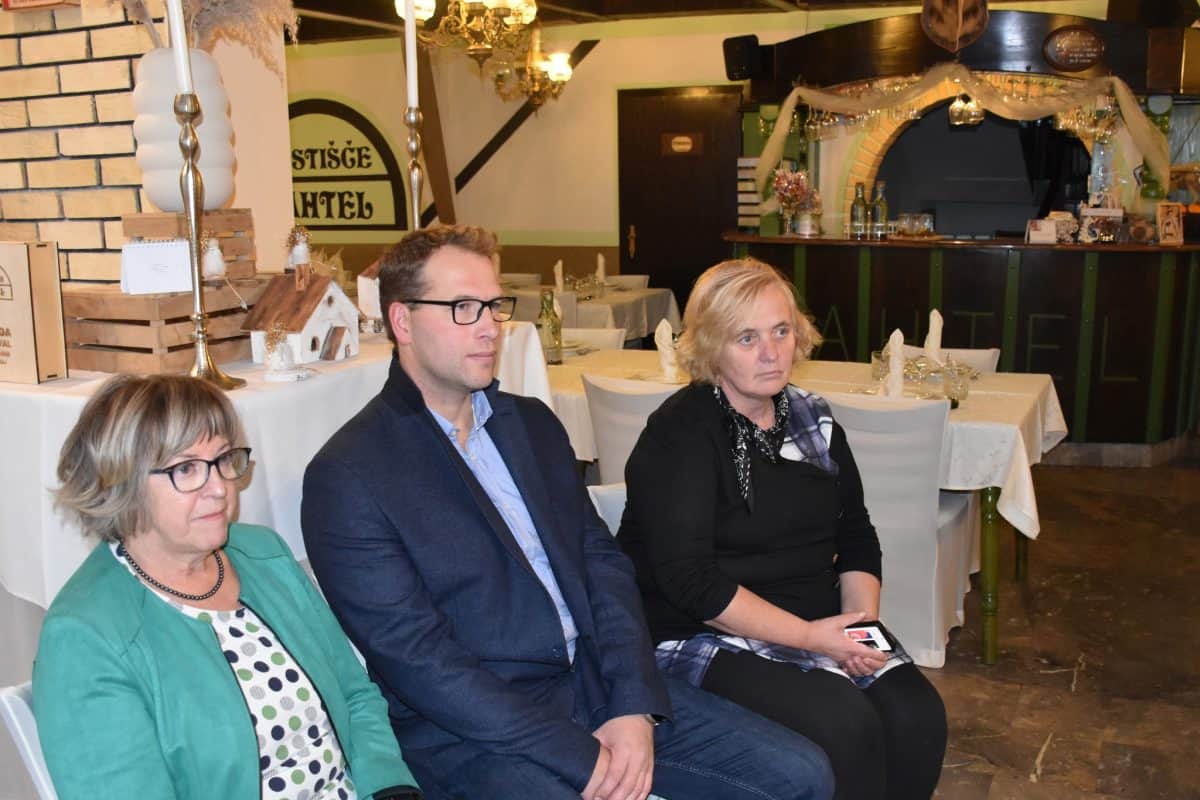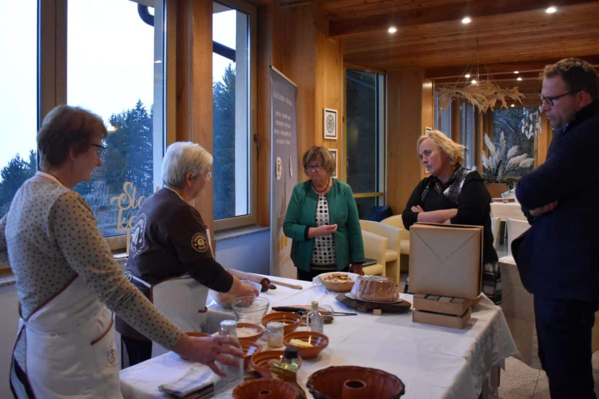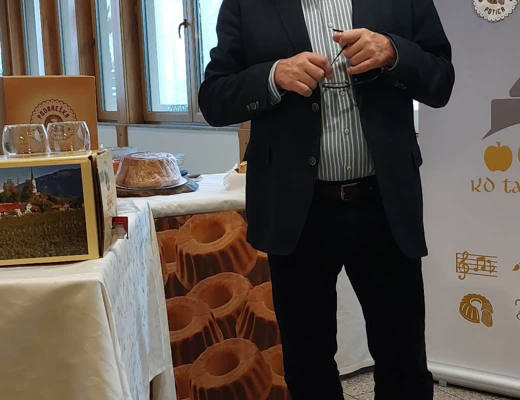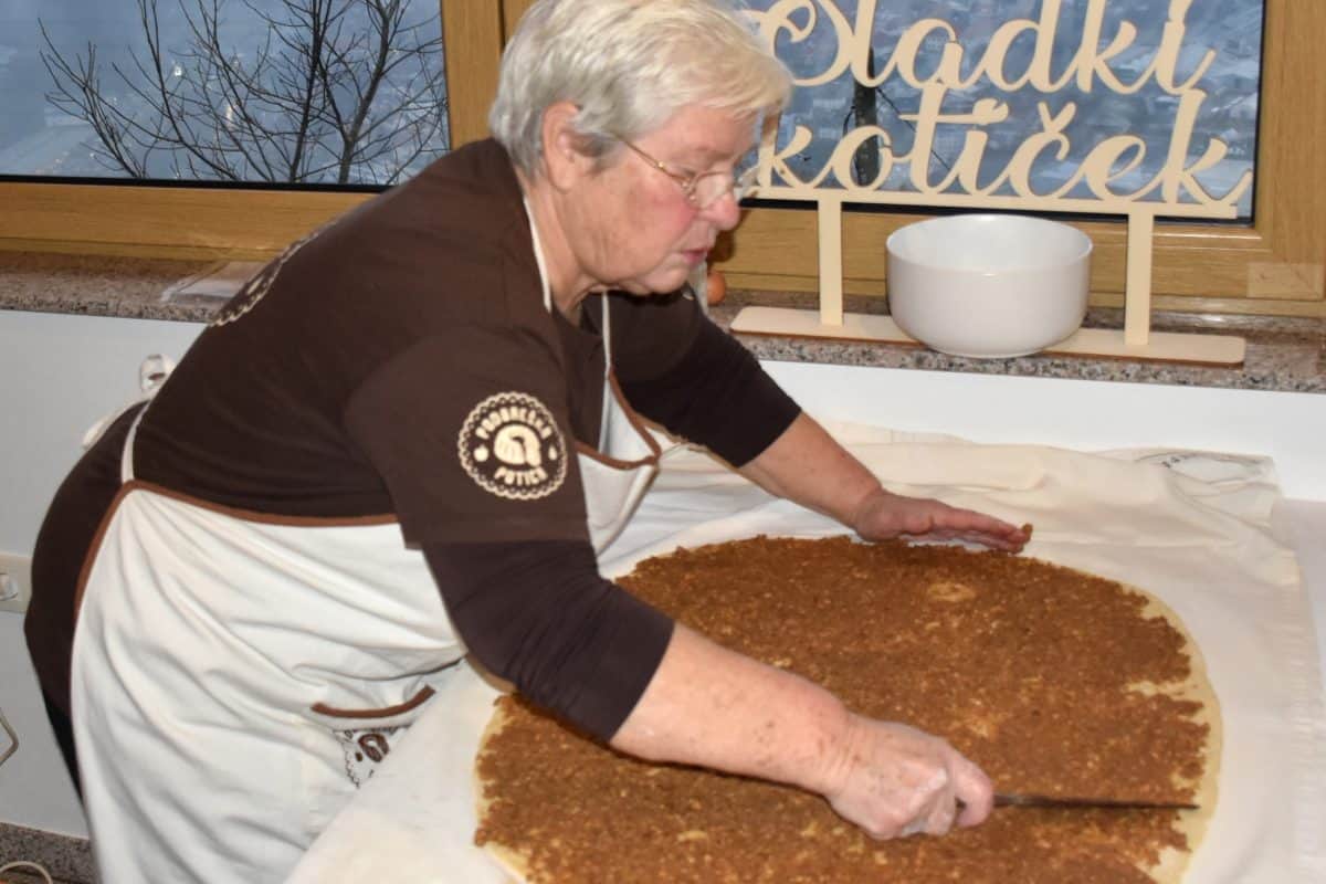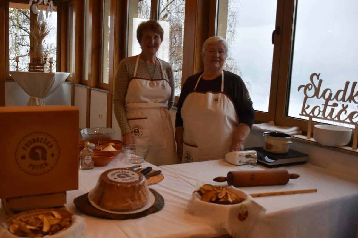 Tu so jih pozdravili in se jim pridružili tudi Primož Povše, podžupan, Martina Šisernik, podžupanja Slovenj Gradca in Jožica Jeromel, predsednica Društva kmetic Mislinjske doline z več kot 300 članicami. Po uvodnem pozdravu in kratki predstavitvi društva ter interesnega združenja Podbreška potica, sta Veronika in Bernarda začeli s predstavitvijo sestavim in postopkom priprave testa ter nadeva iz suhih jabolčnih krhljev.