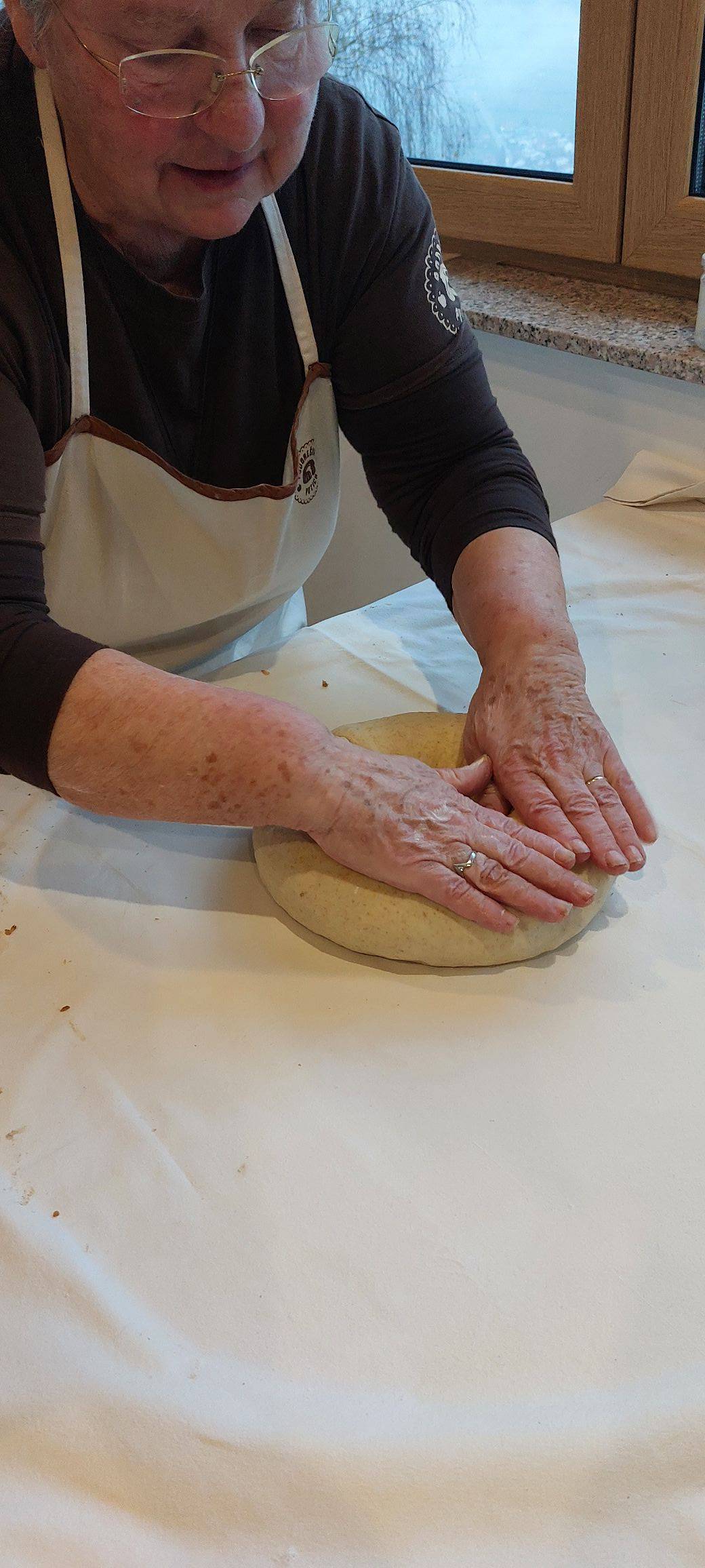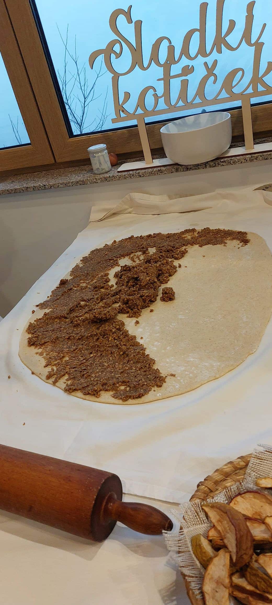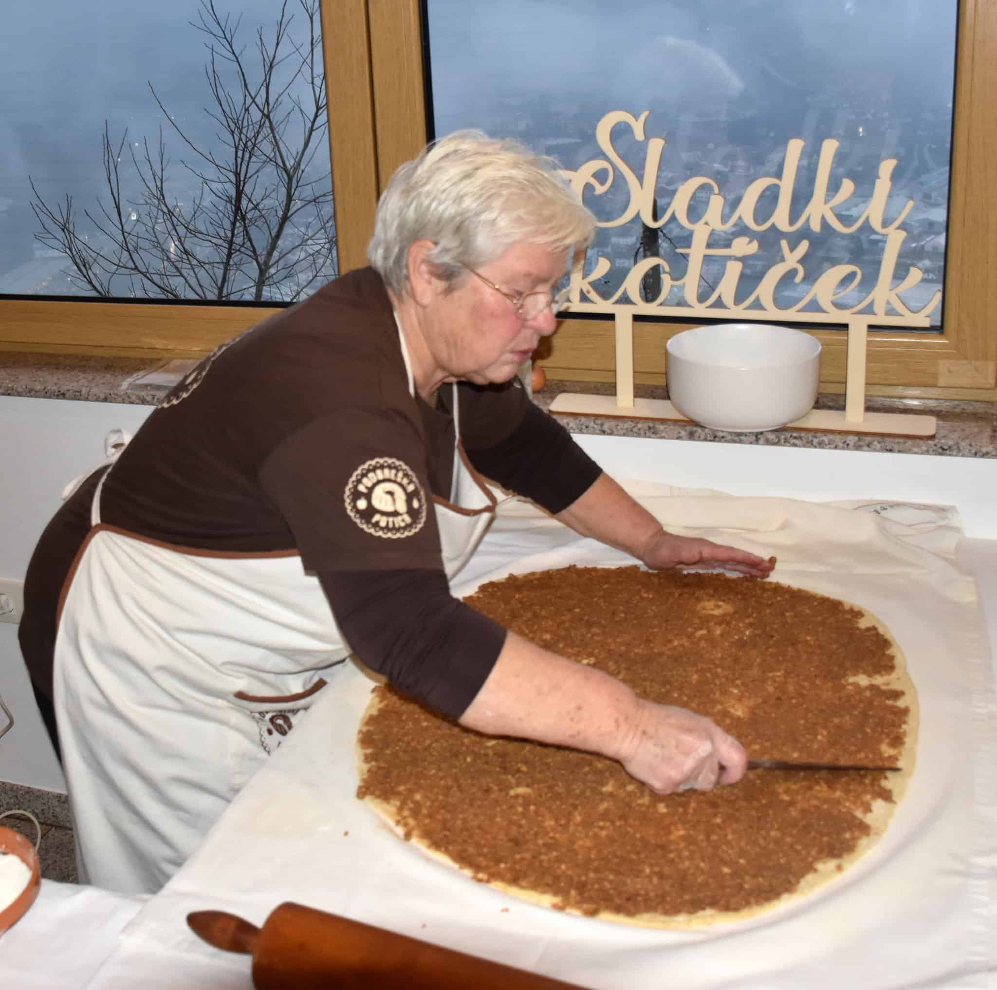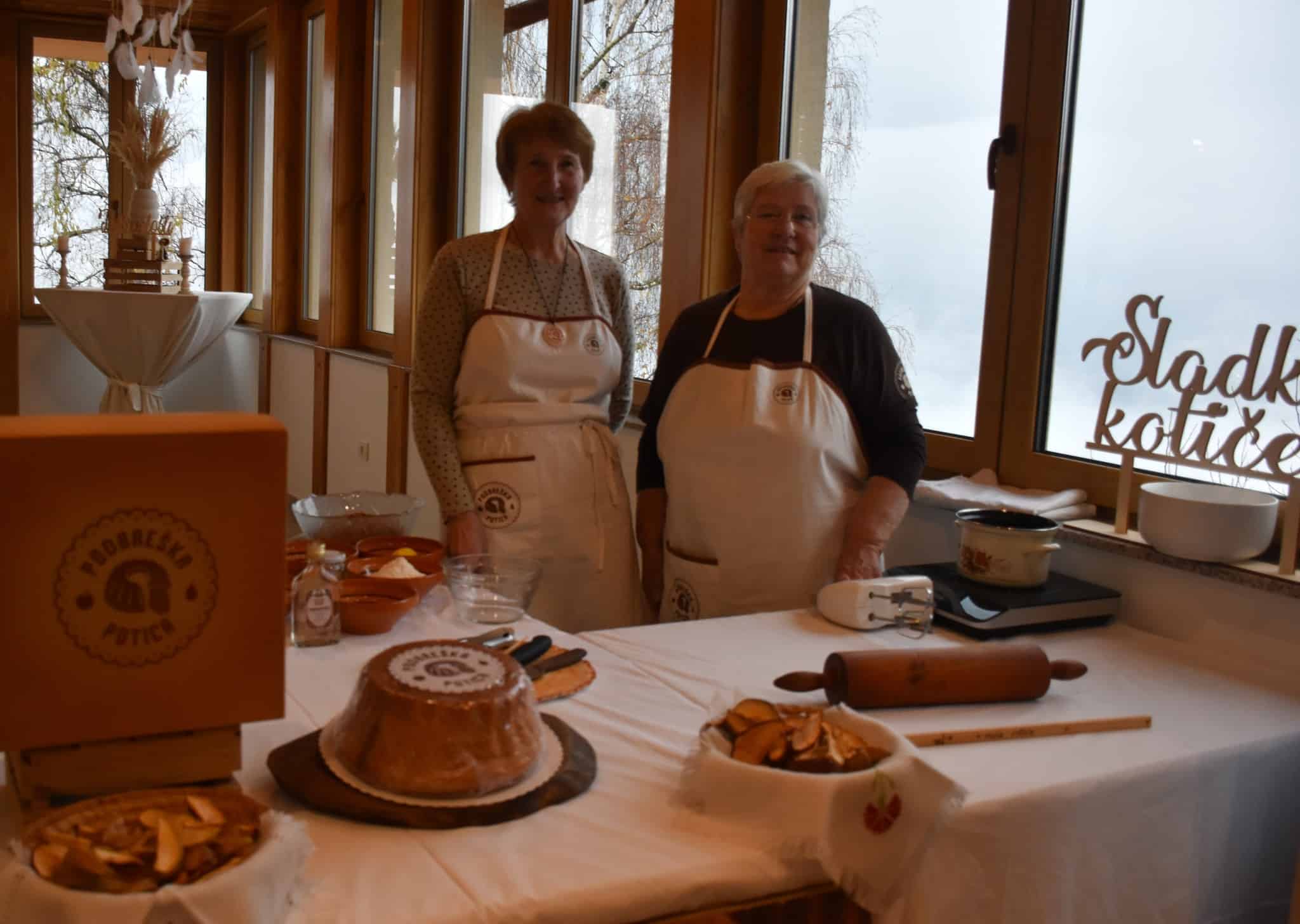 Tu so jih pozdravili in se jim pridružili tudi Primož Povše, podžupan, Martina Šisernik, podžupanja Slovenj Gradca in Jožica Jeromel, predsednica Društva kmetic Mislinjske doline z več kot 300 članicami. Po uvodnem pozdravu in kratki predstavitvi društva ter interesnega združenja Podbreška potica, sta Veronika in Bernarda začeli s predstavitvijo sestavim in postopkom priprave testa ter nadeva iz suhih jabolčnih krhljev.