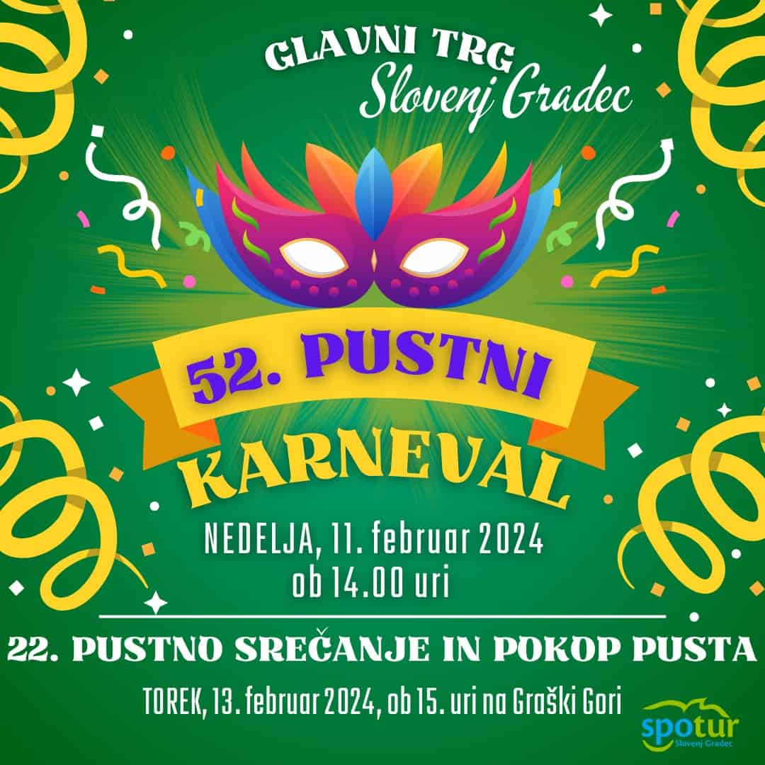 Kot veleva tradicija, bo tudi letos v Slovenj Gradcu potekal Pustni karneval na pustno nedeljo, 11. februarja 2024, od 14. ure naprej na Glavnem trgu v Slovenj Gradcu. Letošnje leto predstavlja že 52. izdajo tega najbolj veselega, norčavega in smeha polnega karnevala. Lansko leto so mestno jedro napolnili zanimivi vozovi, skupinske maske in posamezniki, ki so se našemili v čudovite like, kakršnim smo priča samo v pustnem času.