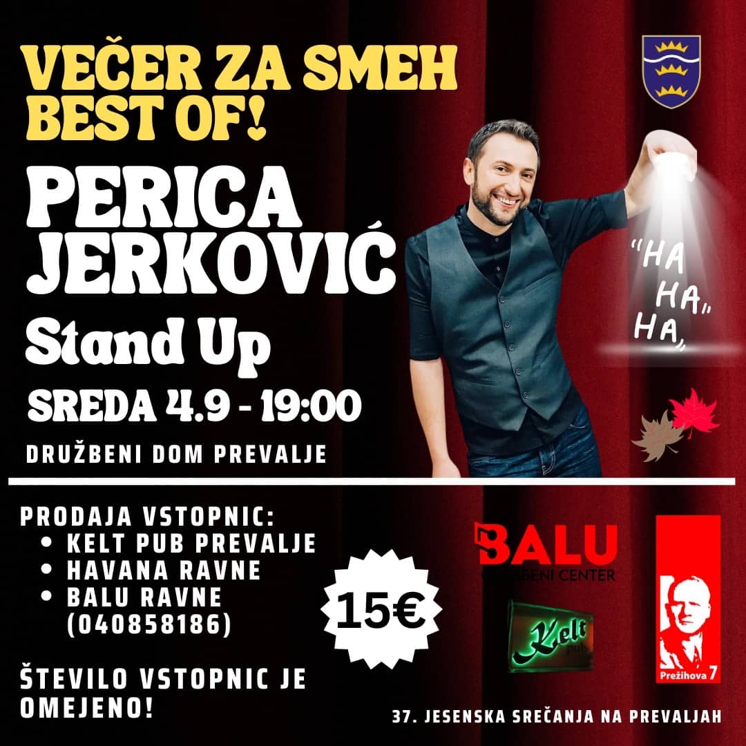 Legenda slovenske stand-up scene Perica Jerković je tokrat zbral svoje najboljše šale zadnjih štirih let in jih združil v nepozaben spektakel ''Best of Perica'', s katerim bo nasmejal čisto vse, ki se mu bodo pridružili v sredo, 4. septembra 2024, ob 19. uri v Družbenem domu na Prevaljah.