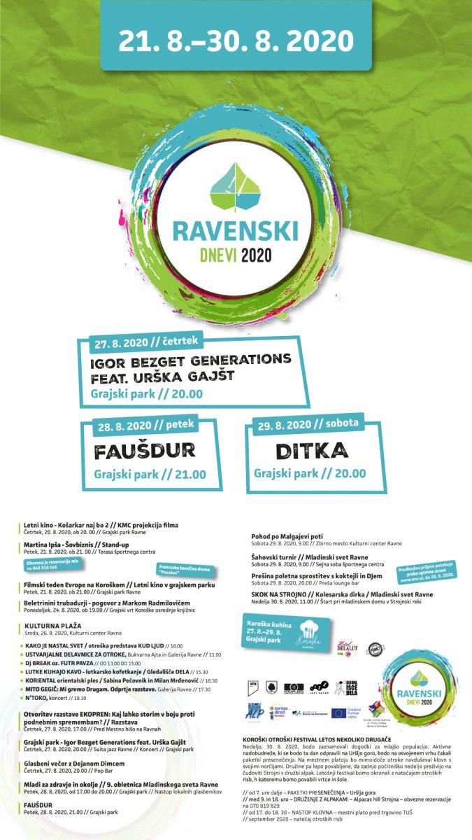 Od četrtka do sobote bodo na prizorišču v parku trije koncerti. Prizorišče bo ograjeno, v njem pa bo ob upoštevanju primerne razdalje na voljo 300 sedišč. V četrtek bodo ob 20. uri nastopili Igor Bezget Generations z Urško Gajšt, v petek bo s pričetkom ob 21. uri že skoraj "tradicionalen" koncert skupine Fauš Dur, v soboto ob 20. uri pa koncert koroške kantavtorice Ditke. Tadej Breznik direktor Kulturnega centra Ravne pa je izpostavil tudi Kulturno plažo, ki bo jutri pred Kulturnim centrom.